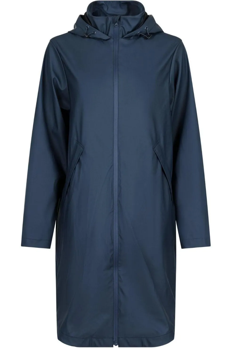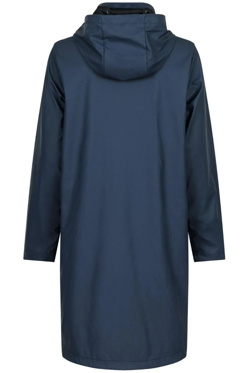 Knælang regnjakke fra Neo Noir i mørkeblå. Jakken har en vandafvisende overflade med mat finish og en praktisk hætte. Den høje hals giver ekstra beskyttelse mod regn og vind.