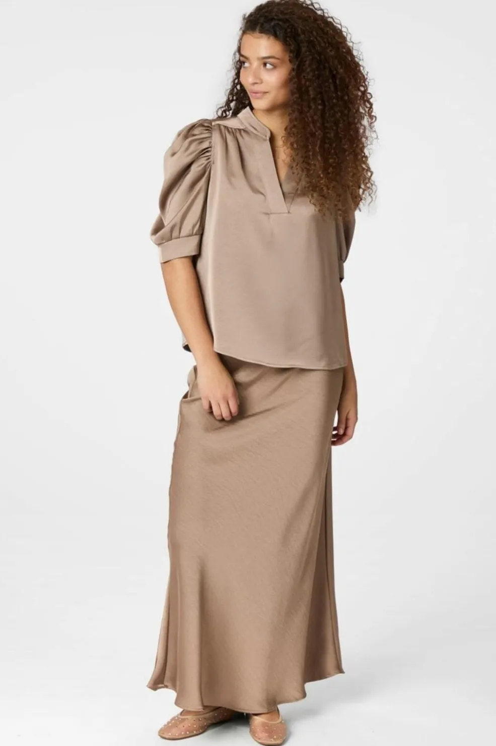 Brun sateen-bluse fra Neo Noir med pufærmer og v-udskæring. Blusen har dekorative syninger og en blød overflade med glans.