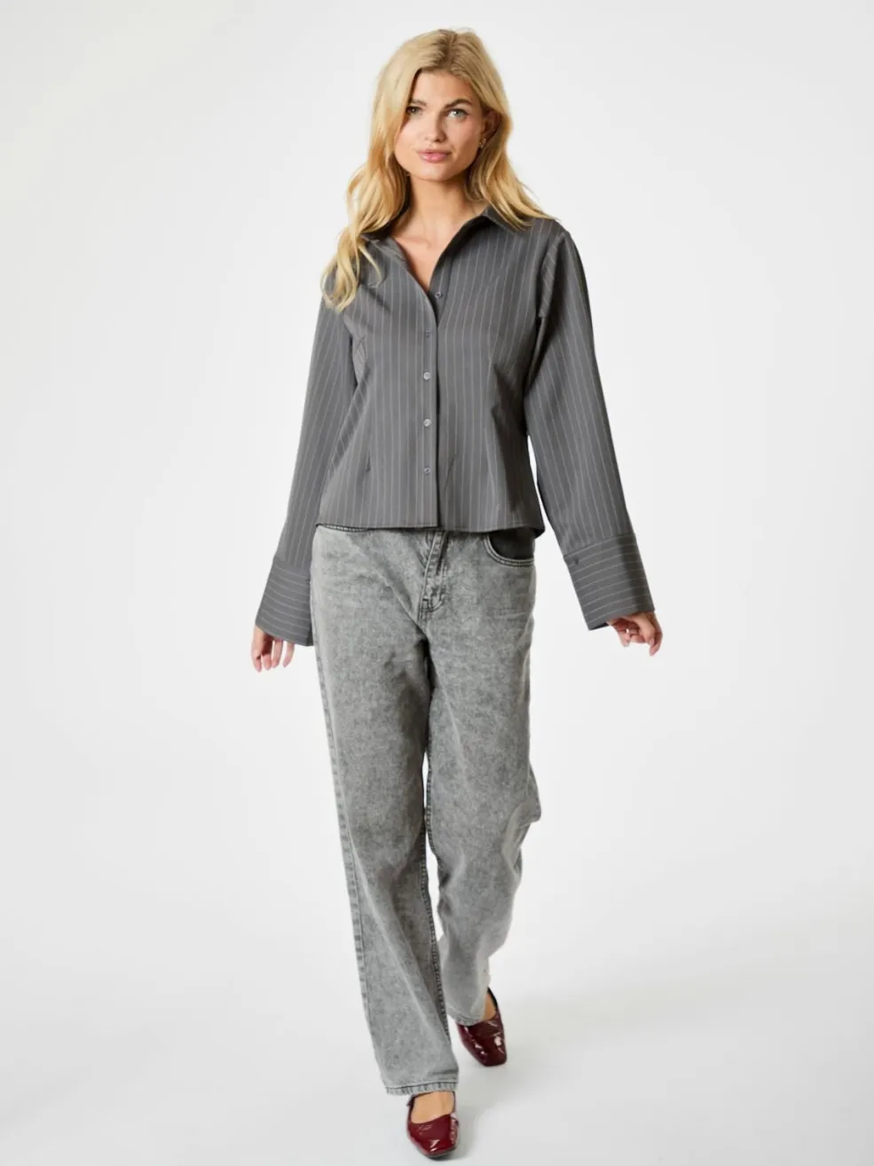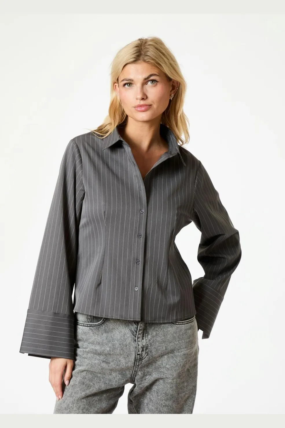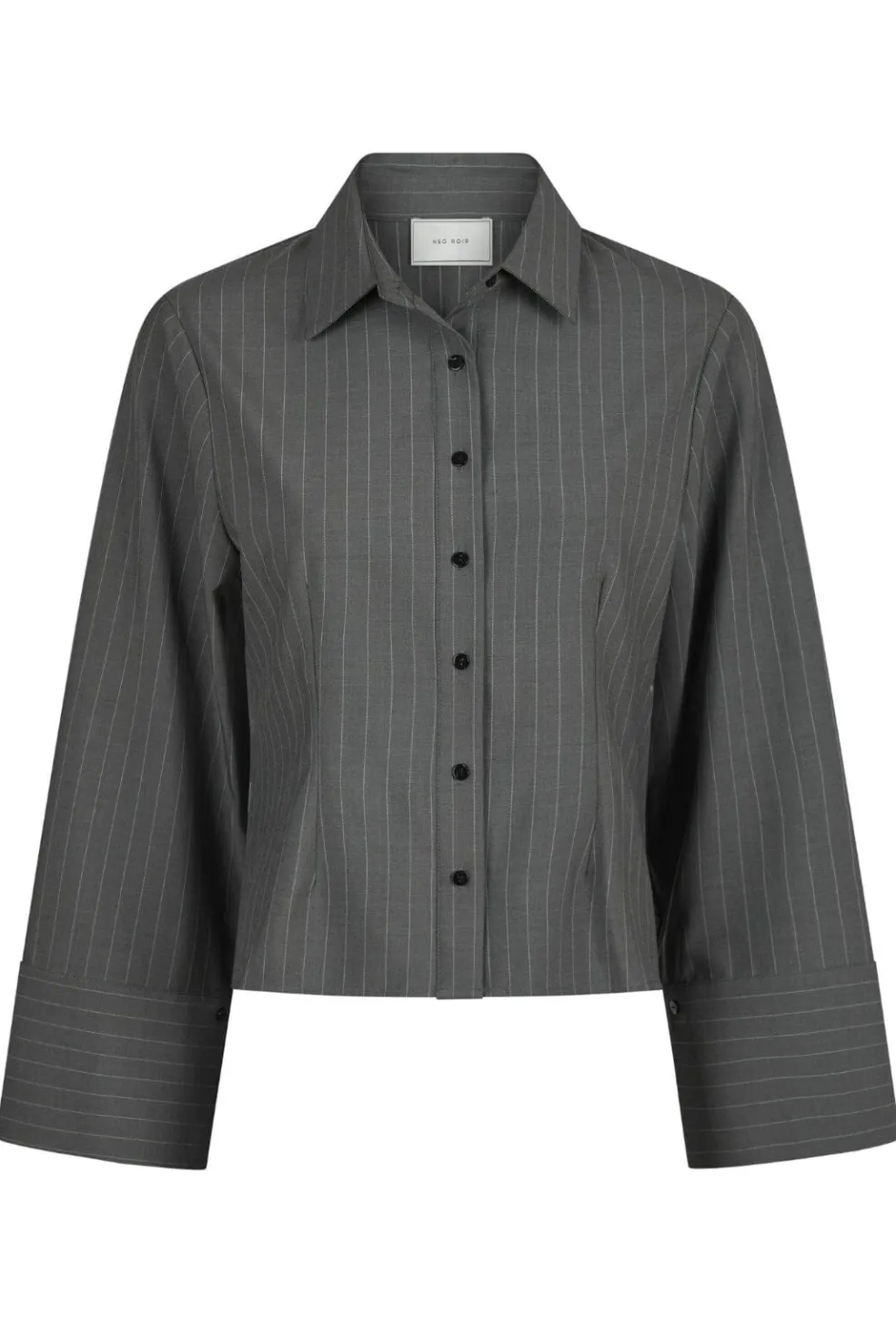 Grå skjorte fra Neo Noir med rosa nålestribet mønster. Skjorten har lange ærmer, skjortekrave og knaplukning foran.