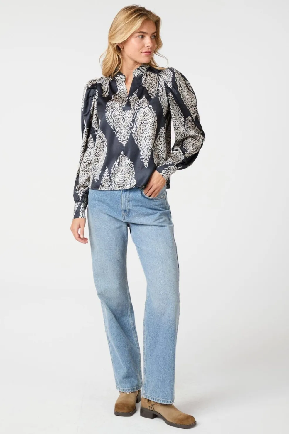Mørkeblå bluse fra Neo Noir med et paisley-mønster i navy og creme. Blusen har puffede ærmer og en v-hals, der skaber en god balance i designet.
