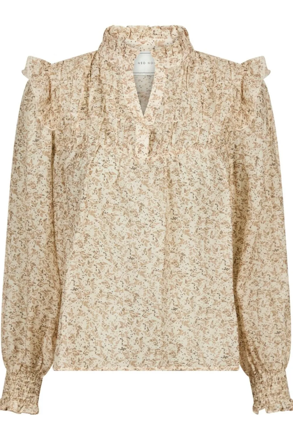 Blomstret bluse fra Neo Noir i off-white med beige nuancer. Blusen har en V-halsudskæring med flæser ved skuldrene og lange ærmer med smockdetaljer ved manchetterne.