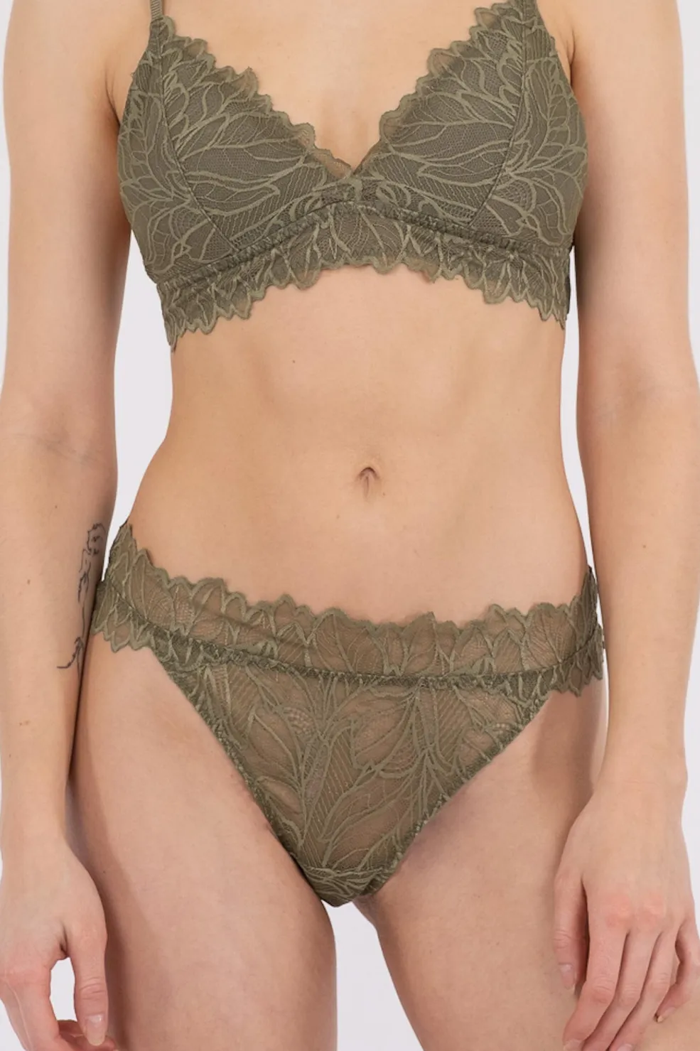G-stringtrusse fra Neo Noir i støvet armygrøn. Modellen har et blomstret blondemønster og elastik i taljen. Den bløde blonde giver undertøjet et fint udtryk.