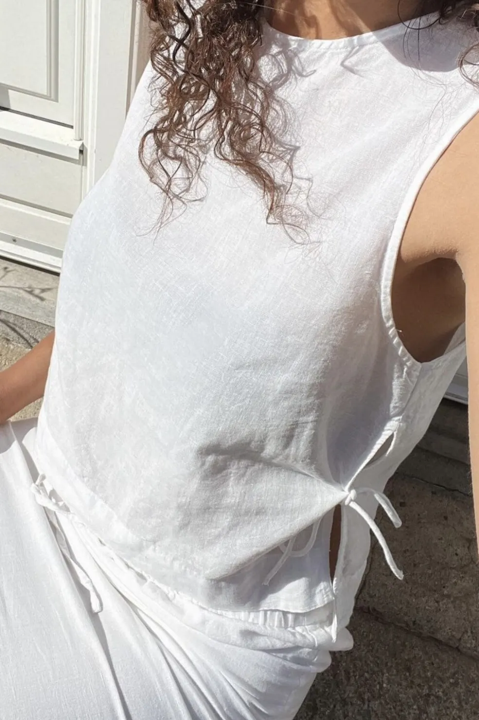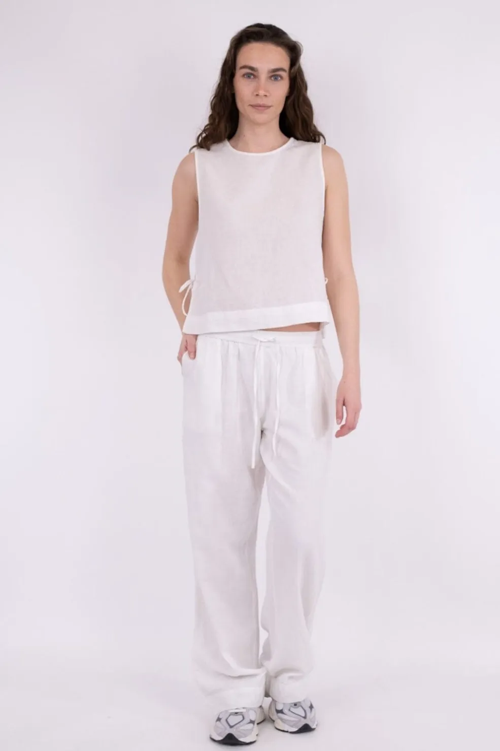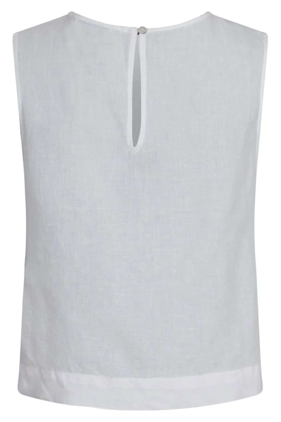 Hvid linnetop fra Neo Noir med bindebånd i siden. Toppen har et ærmeløst design og er lavet af en blanding af hør og bomuld, der giver en let og luftig fornemmelse.