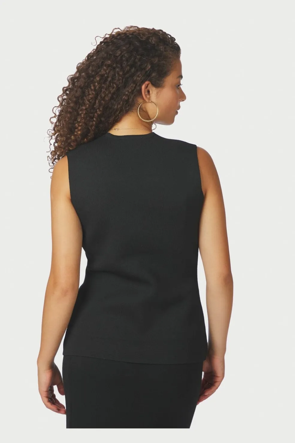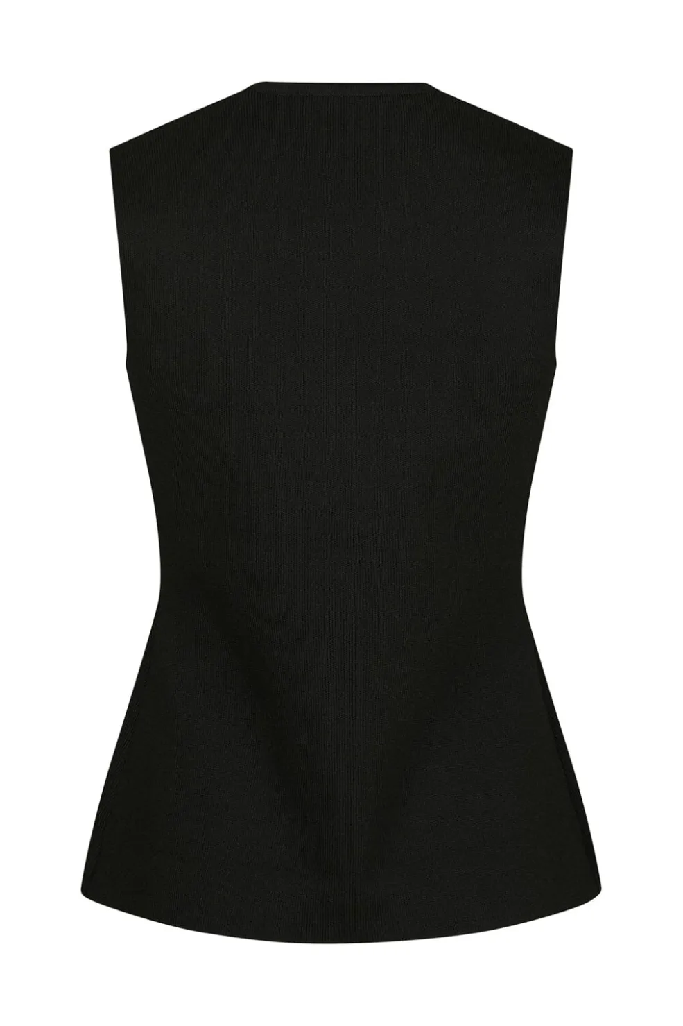 Sort strikvest fra Neo Noir med V-hals og guldknapper. Vesten har en slim fit-pasform og en praktisk splitåbning foran, der gør den nem at justere.