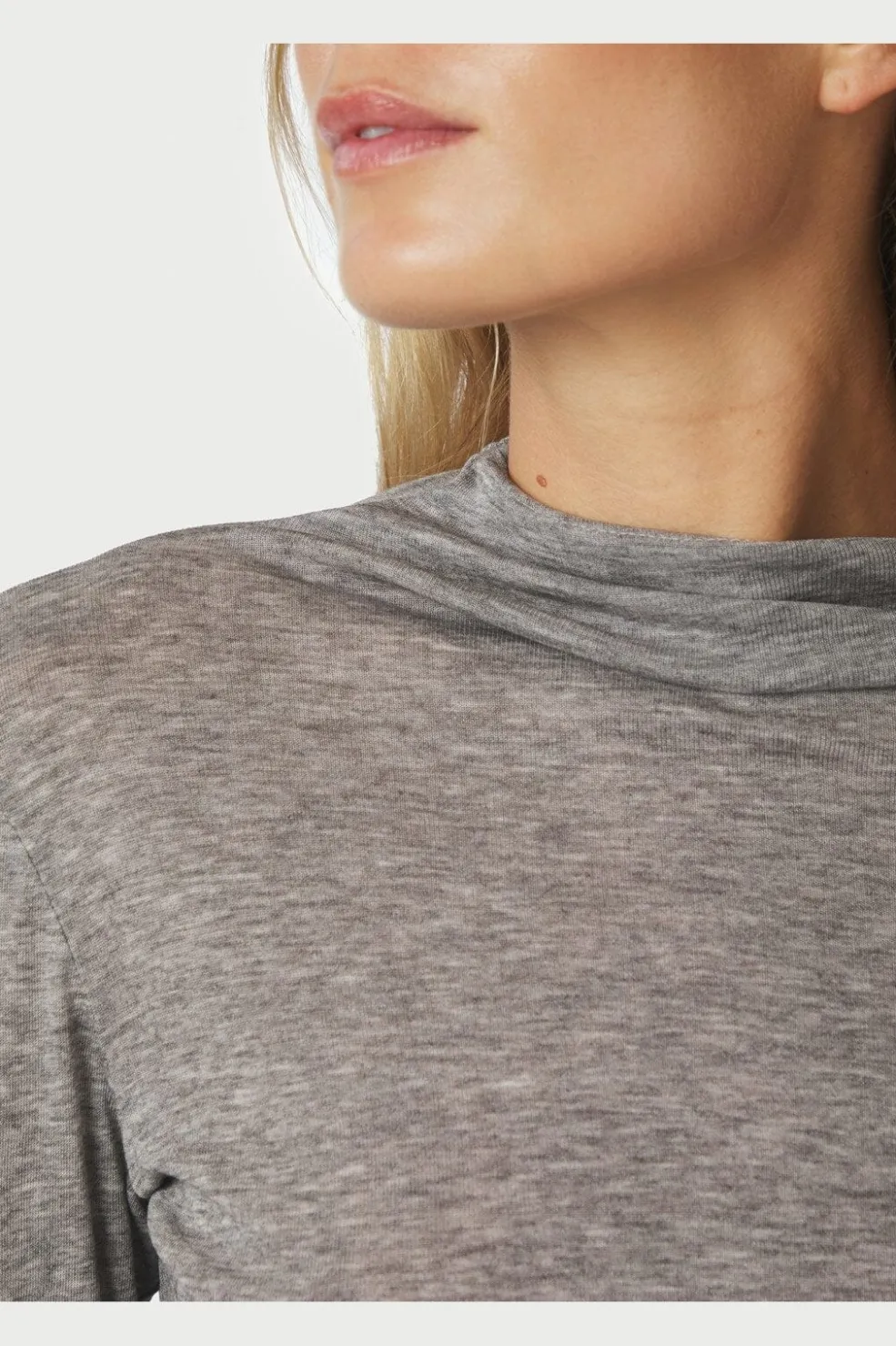 Grå ribstrikket bluse fra Neo Noir med høj hals og tætsiddende pasform. Blusen har en meleret overflade og er fremstillet i en blød blanding af lyocell og uld.