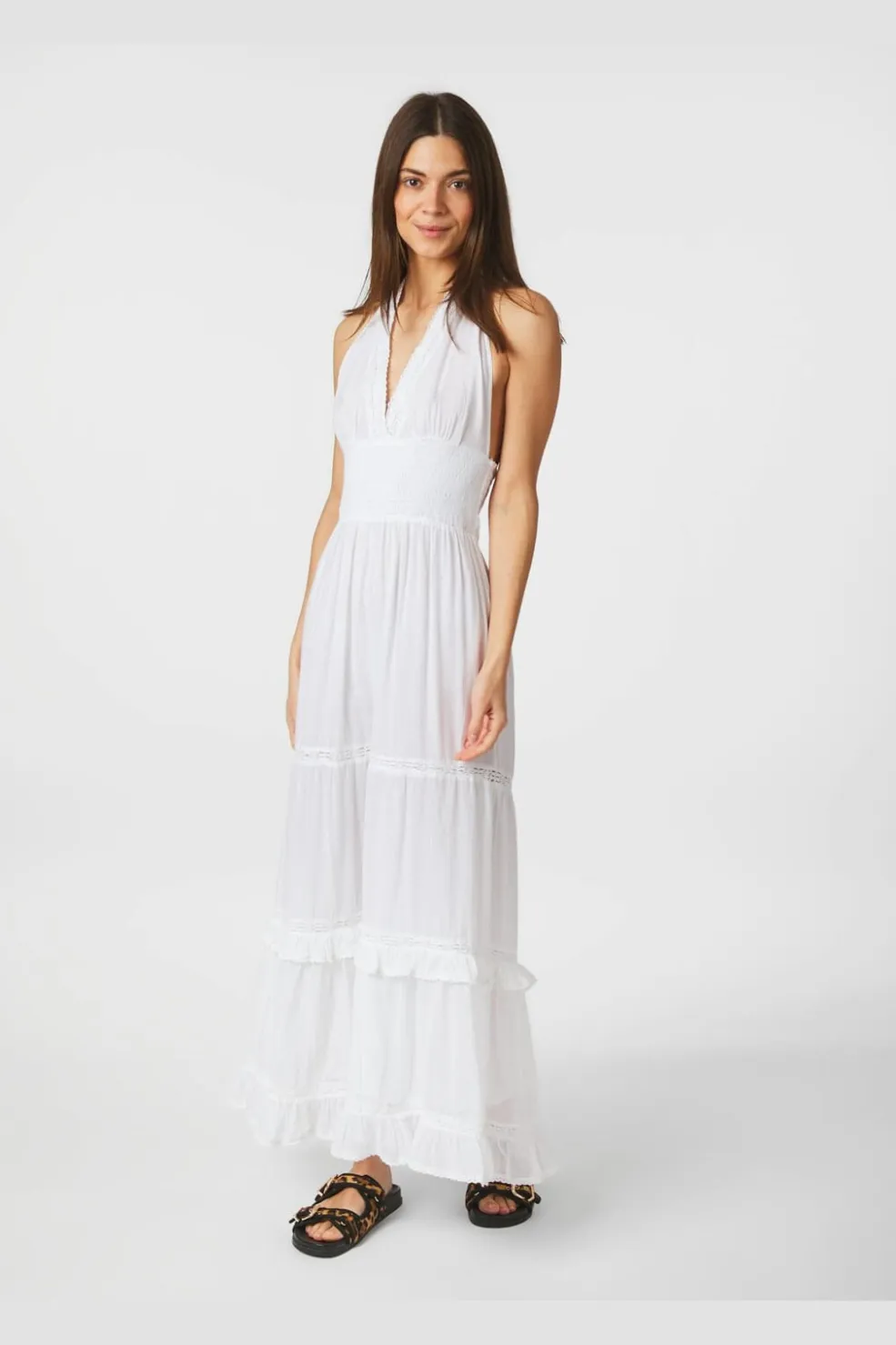 Hvid bomuldskjole fra Neo Noir med v-hals og bindebånd i nakken. Kjolen har smocksyning under brystet og et løst skørt med flæser og blondedetaljer.