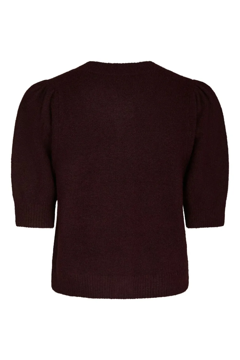 Vinrød cardigan fra Neo Noir med korte pufærmer. Cardiganen har rund halsudskæring og perleknapper foran, der giver et fint præg på den ensfarvede strik.
