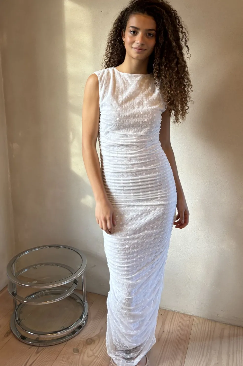 Hvid meshkjole fra Neo Noir med rynker langs siderne. Kjolen har en tætsiddende pasform og ankellængde med blomstrede detaljer i stoffet.