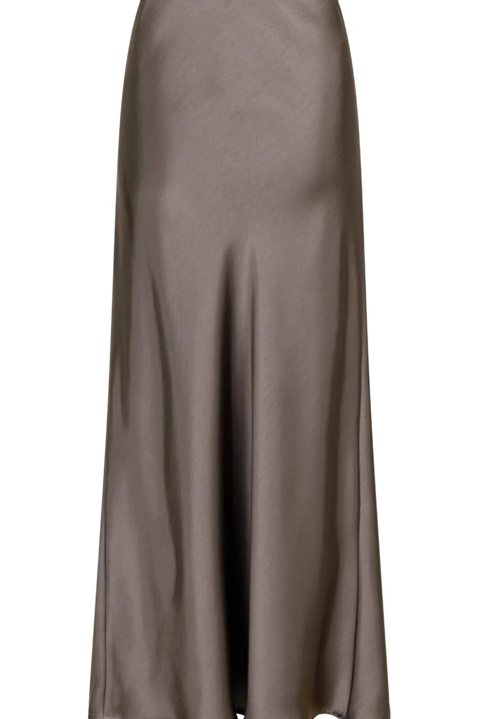 Lang nederdel i varm grå fra Neo Noir. Lavet af blødt satin med skrå skæring og indvendig elastik i taljen.
