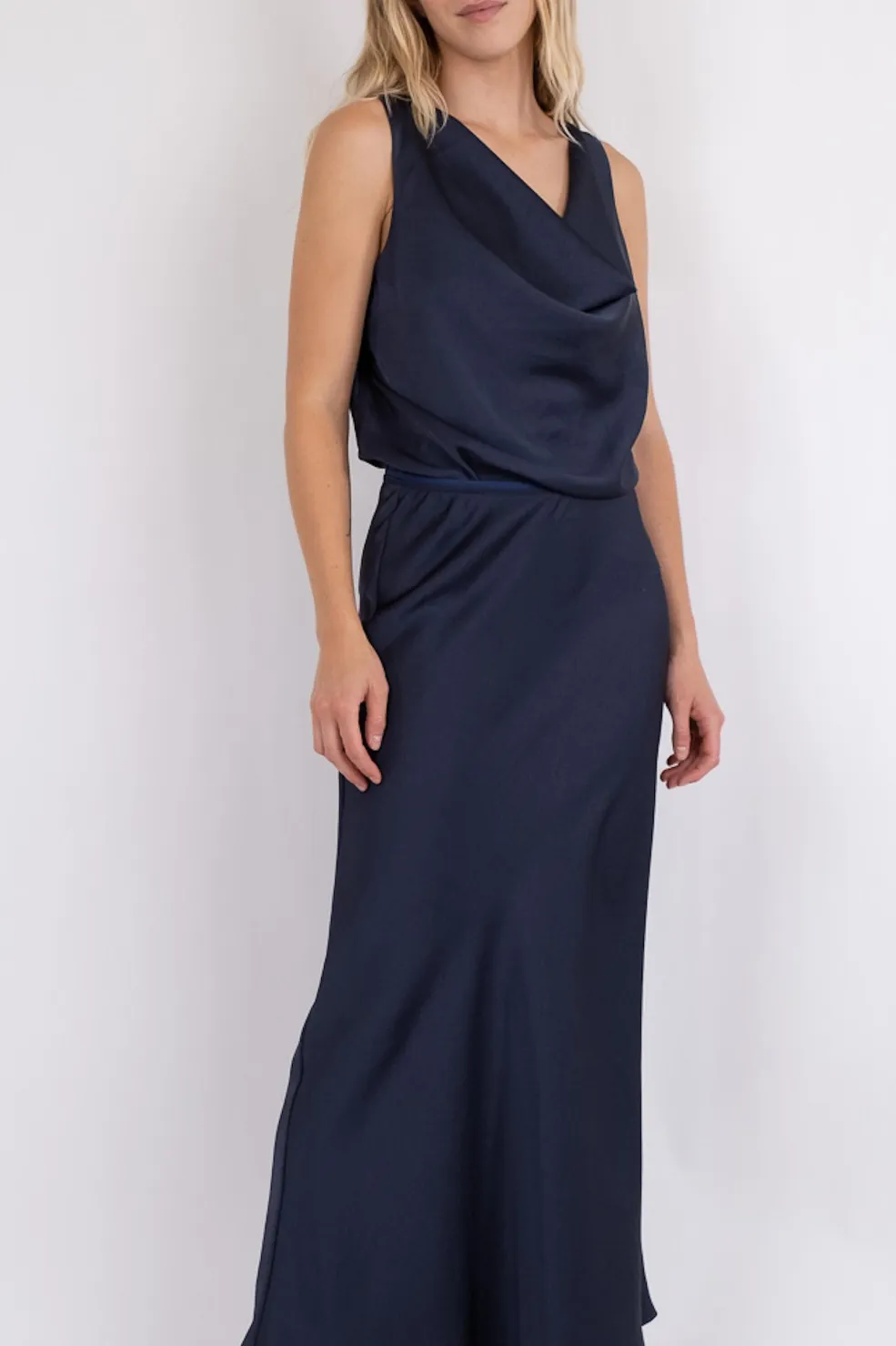 Mørkeblå nederdel i heavy sateen fra Neo Noir. Den skrå skæring og ankellængden giver nederdelen et rent snit og god bevægelighed.
