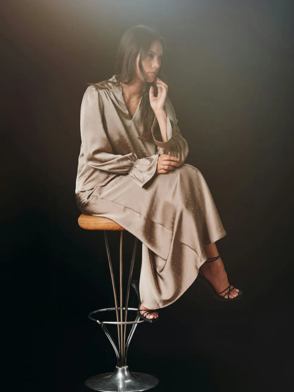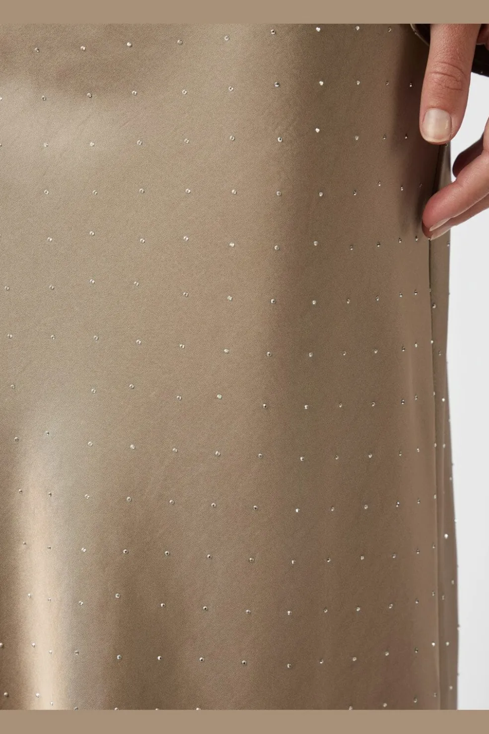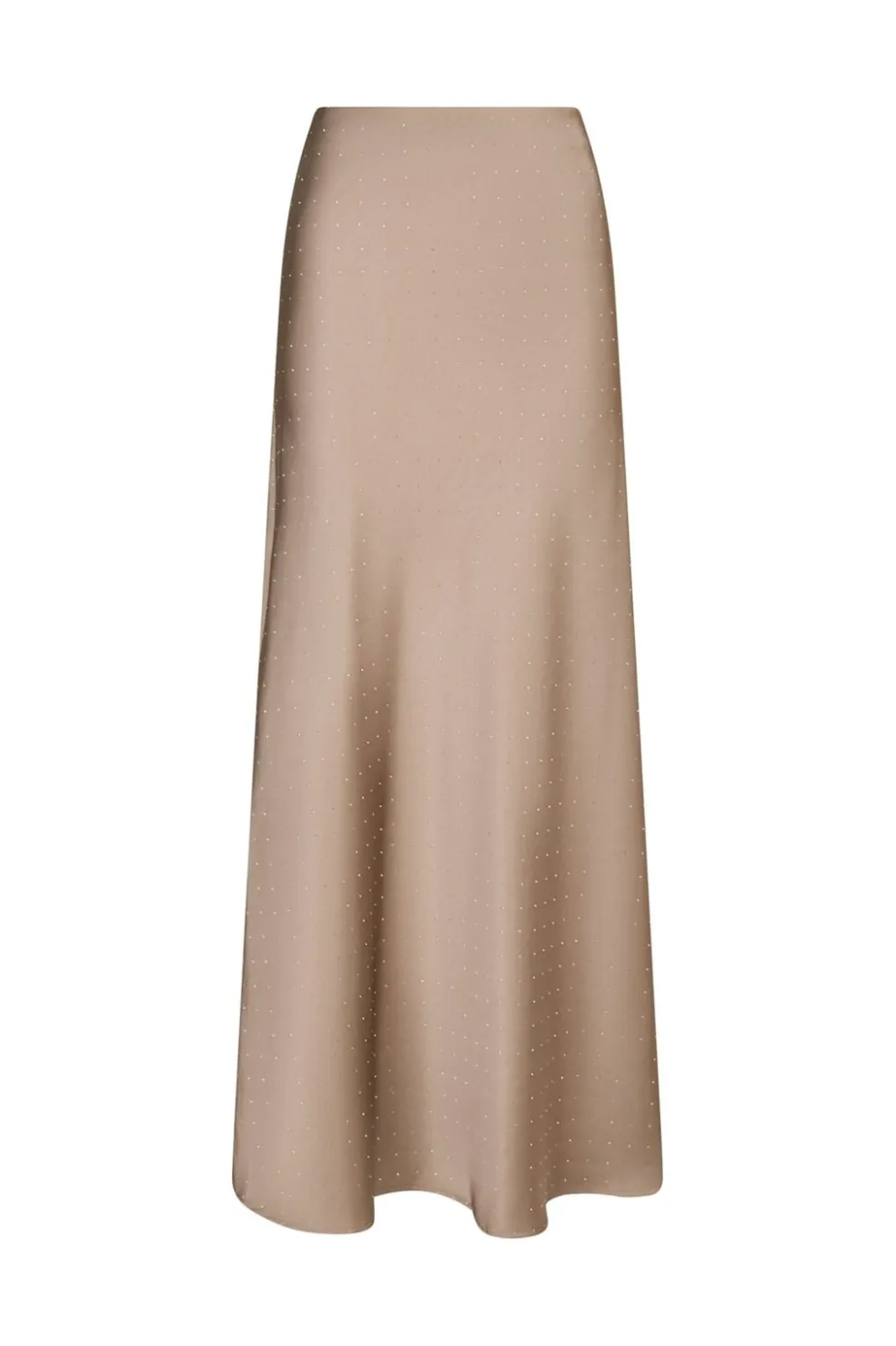 Lang nederdel fra Neo Noir i brun-grå satin med små pailletter fordelt i et prikkemønster over hele nederdelen.