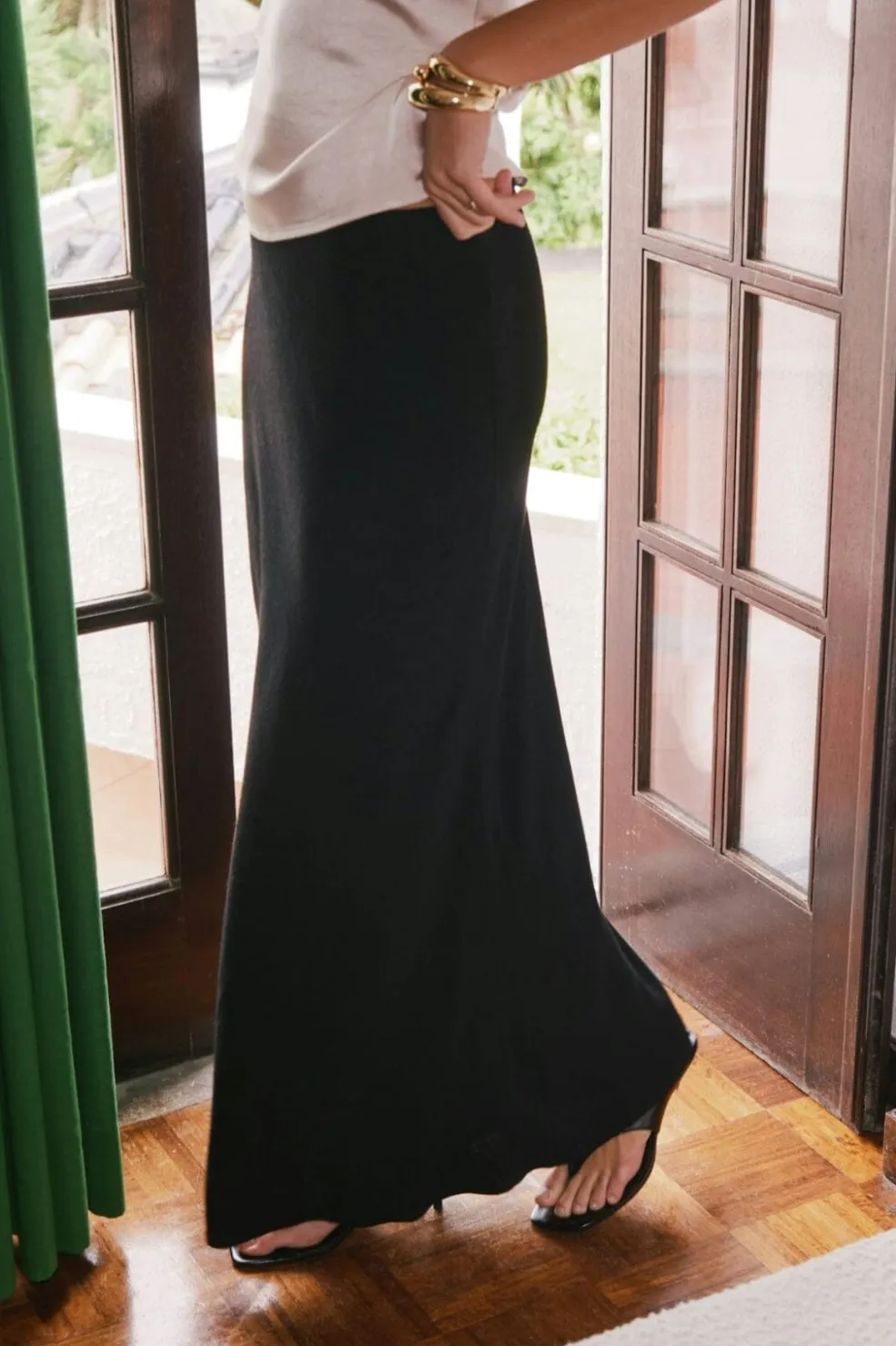Sort nederdel fra Neo Noir i en blanding af viscose og hør. Den skrå skæring skaber bevægelse i stoffet, og den knælange længde giver god dækning.