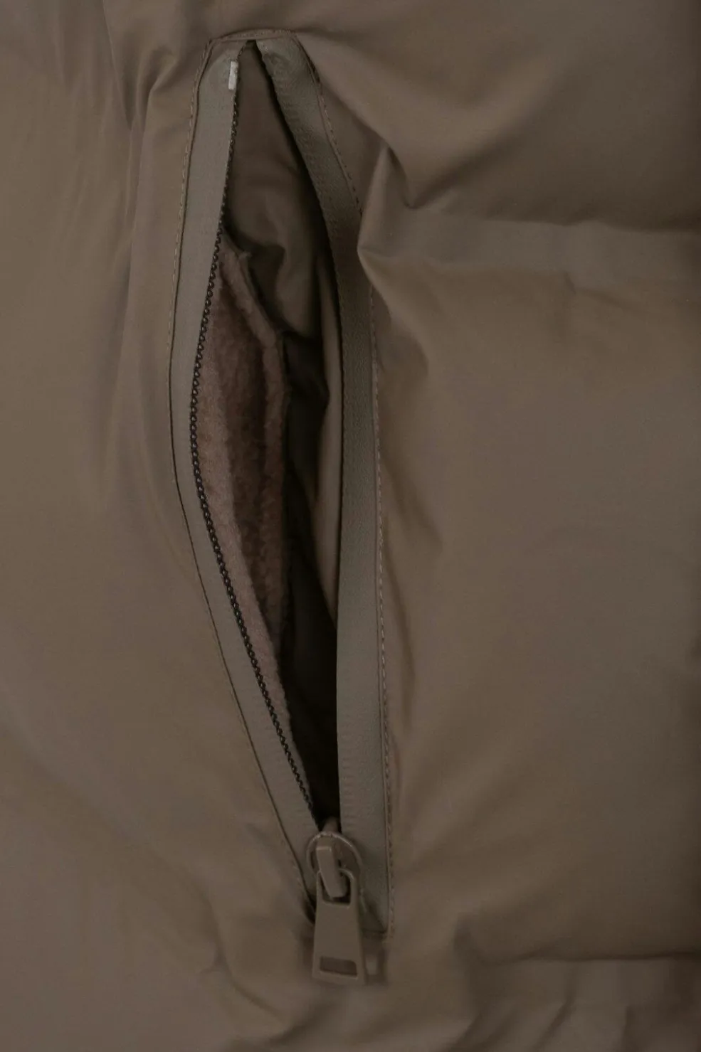 Cool vatteret jakke som er regnafvisende. Kvaliteten er blød og mat og giver et fedt look. Jakken er lang og har aftagelig hætte og lånlås i siderne. Modellen er 176cm og bærer en størrelse 36.