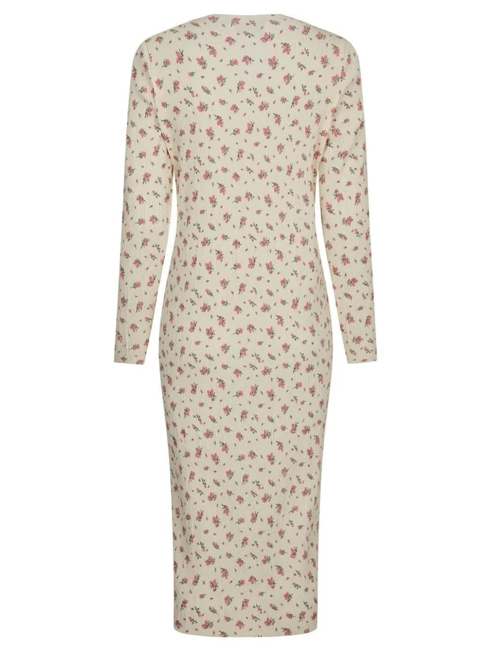 Lysegul kjole fra Neo Noir med pink og grønne blomster. Den har lange ærmer, rund hals og høje slidser i siderne. Kjolen er ankellang med en tætsiddende pasform.