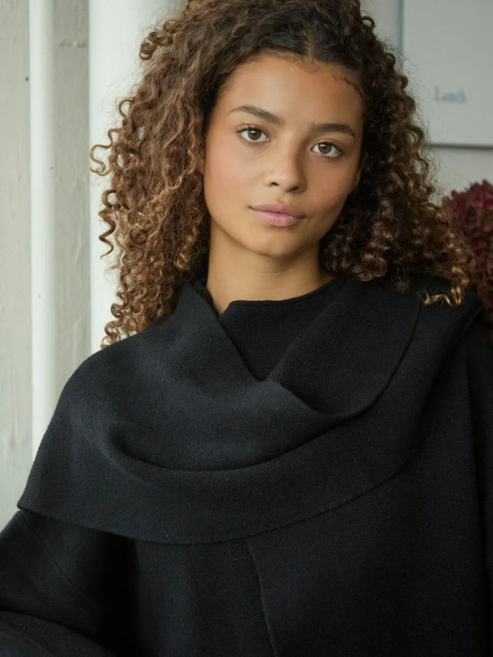 Sort strikbluse fra Neo Noir med indbygget tørklædedetalje ved halsen. Blusen har en løs pasform og 3/4-ærmer, der gør den praktisk til hverdagsbrug.