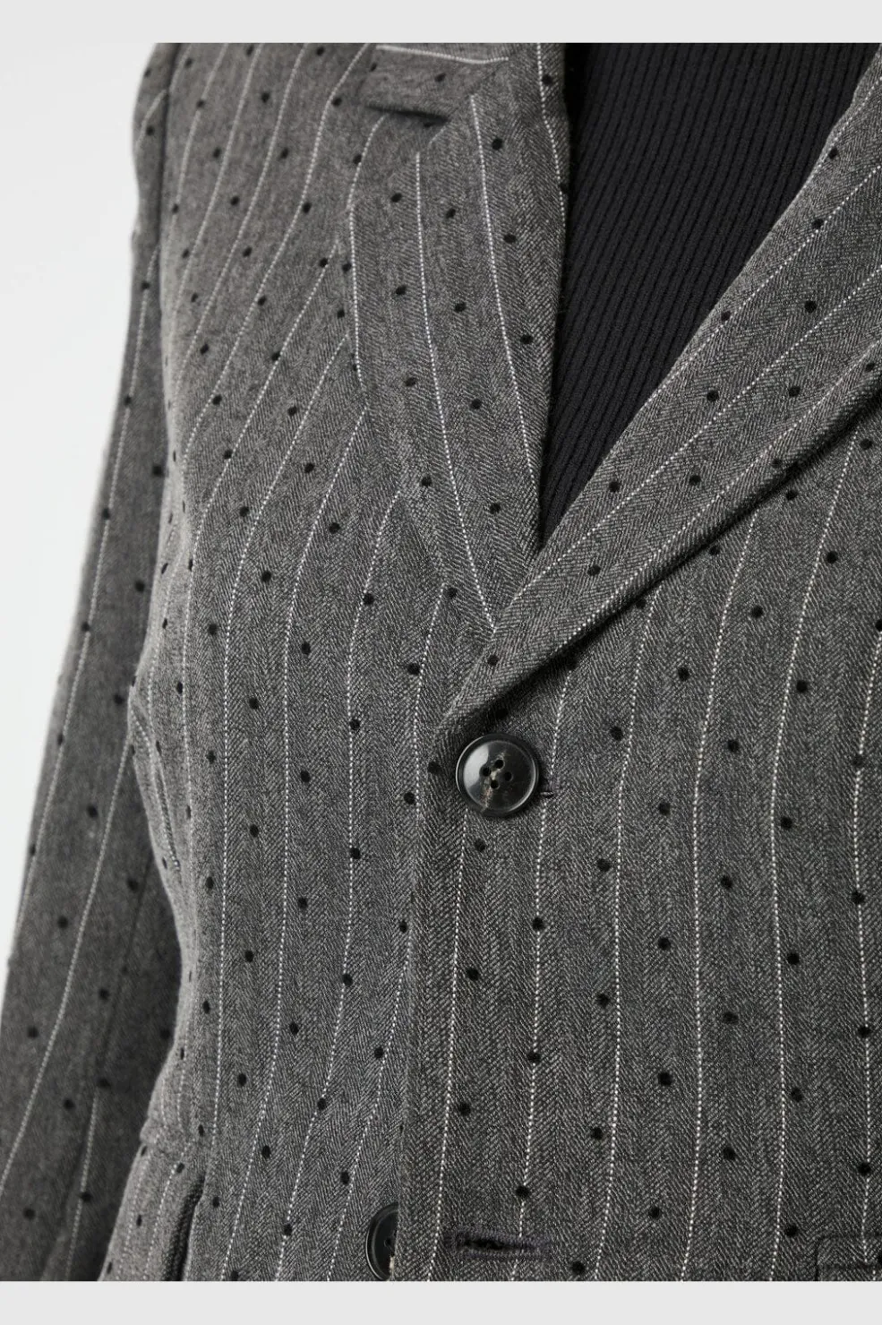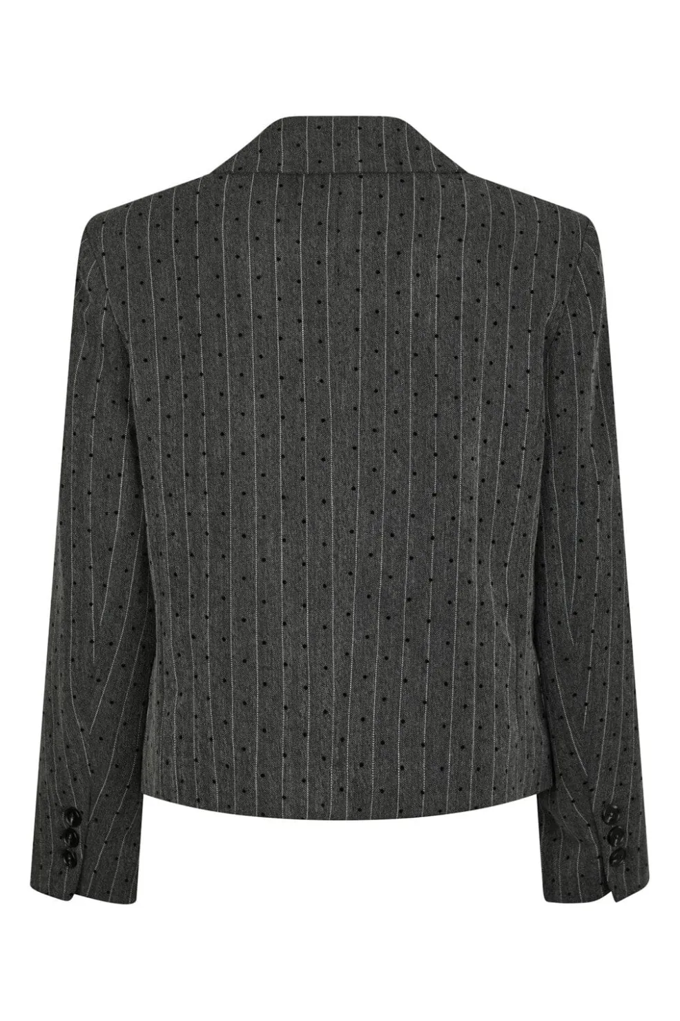 Mørkegrå blazer fra Neo Noir med en kombination af pinstripe, polka dot og herringbone-mønster. Blazeren har en kort, tætsiddende pasform med reverskrave og to-knapslukning.