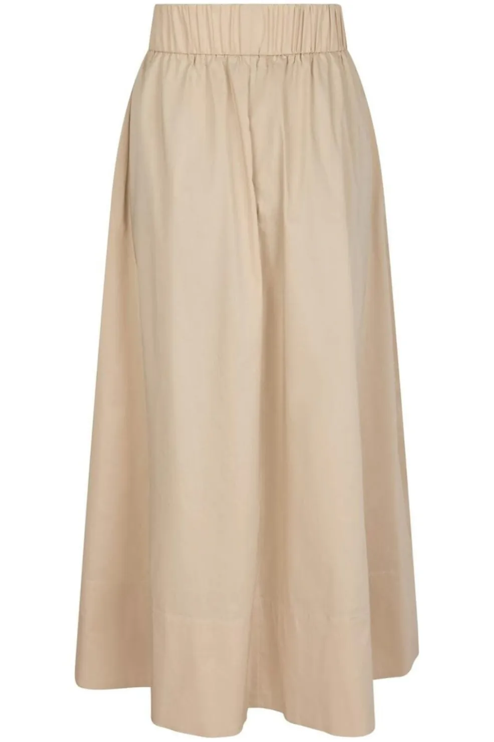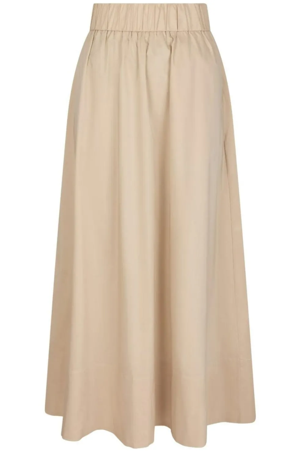 Lang poplin-nederdel fra Neo Noir i beige. Den har høj talje med elastik og falder løst ned til midt på læggen. Sidelommer og ruching giver nederdelen et feminint præg.