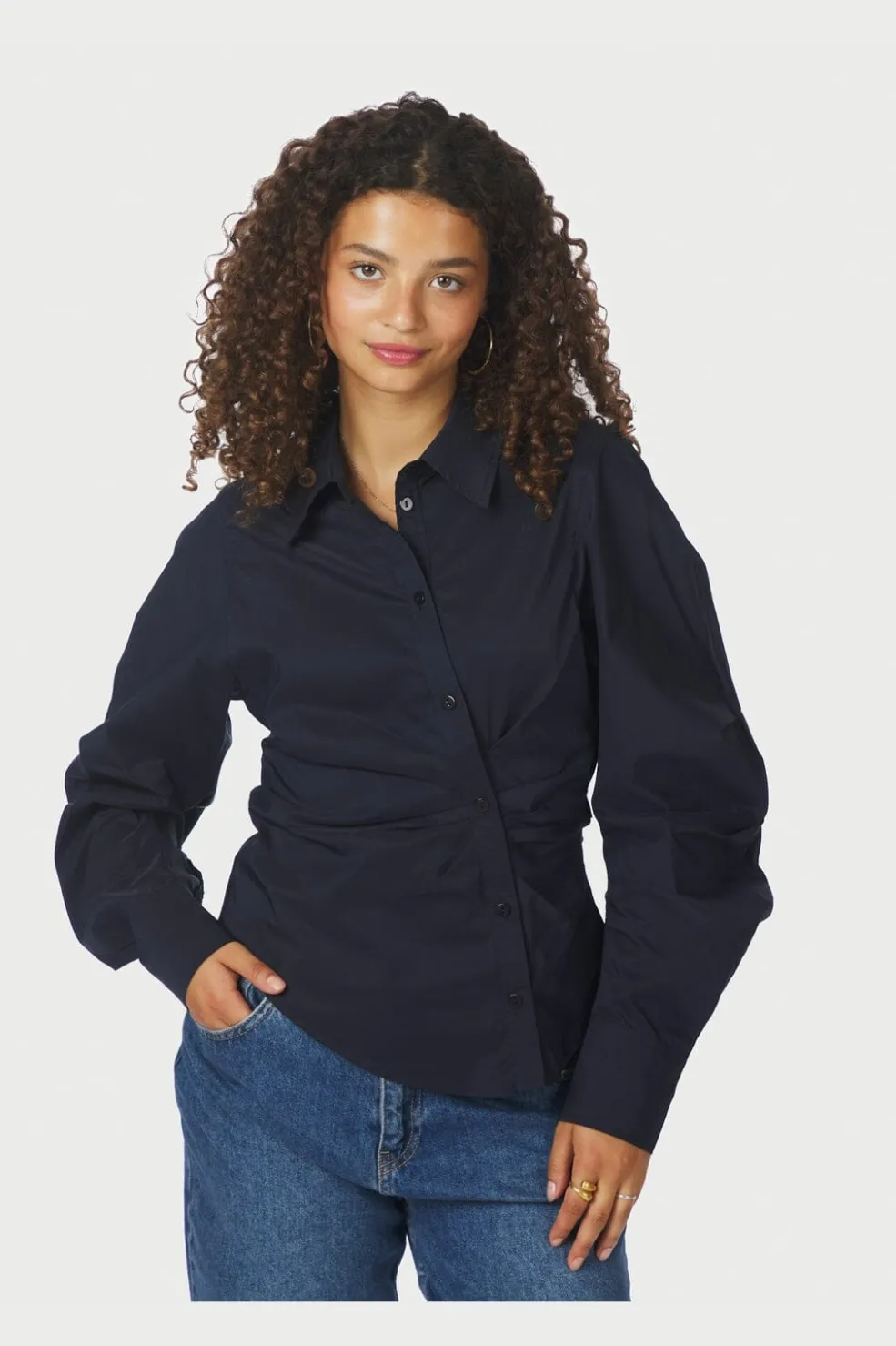 Mørkeblå skjorte fra Neo Noir med asymmetrisk knaplukning foran. Skjorten har en slim fit-pasform og rynkede detaljer ved taljen samt lange ærmer med puf.