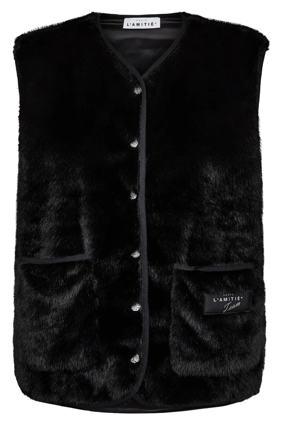 Sort vest fra Haute L’Amitié med blød, pelslignende tekstur over hele overfladen. Vesten har v-hals og knappelukning foran.