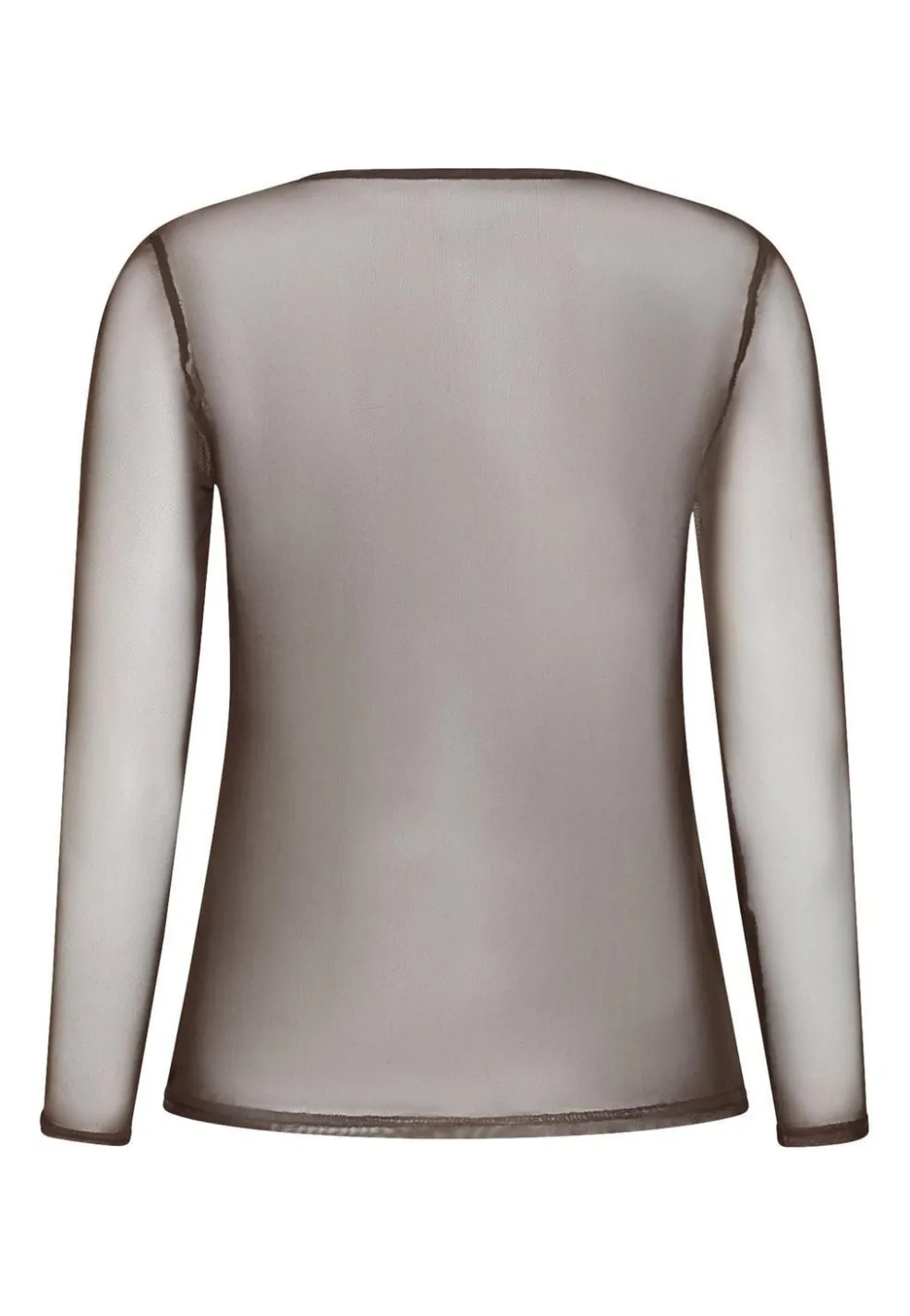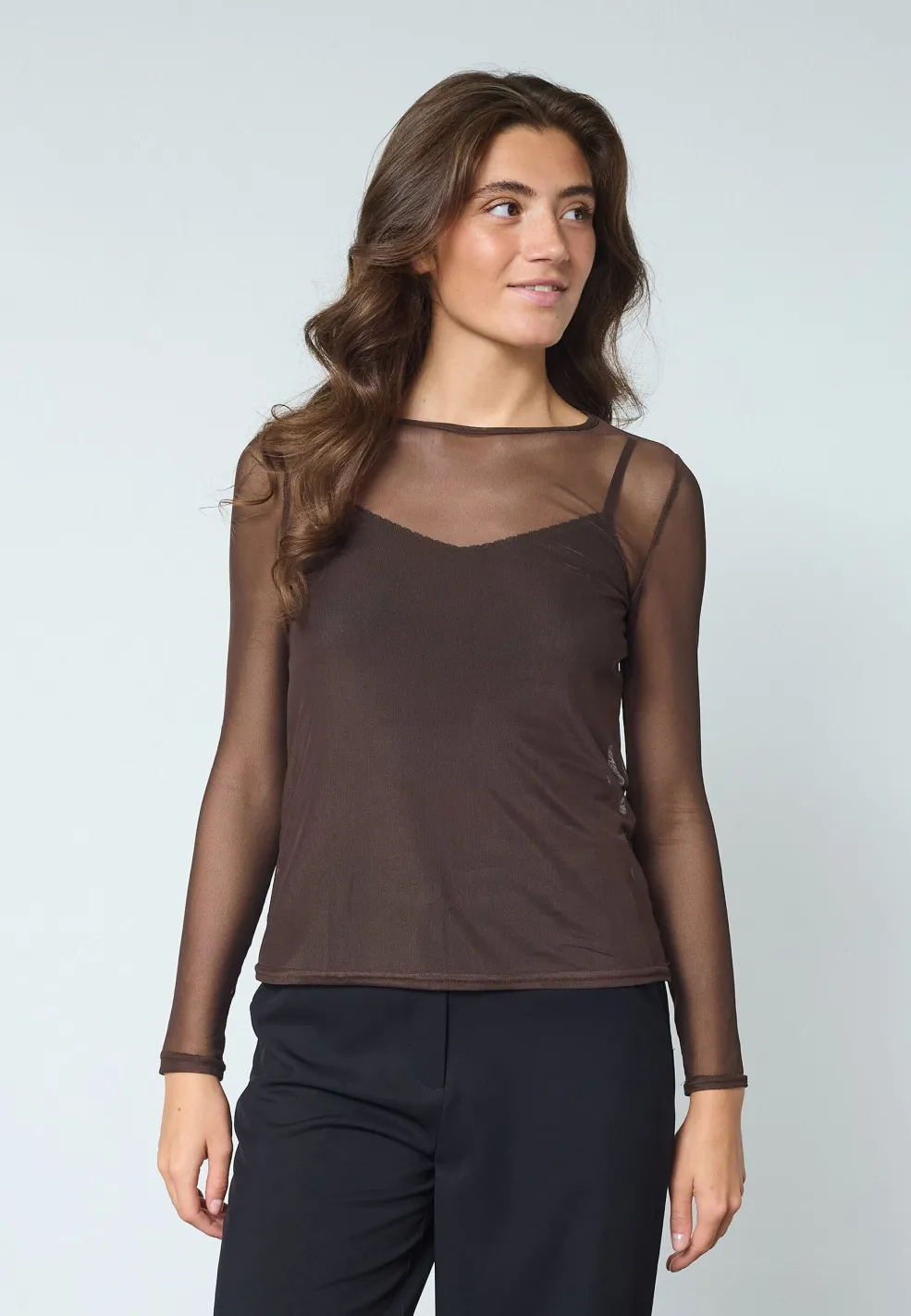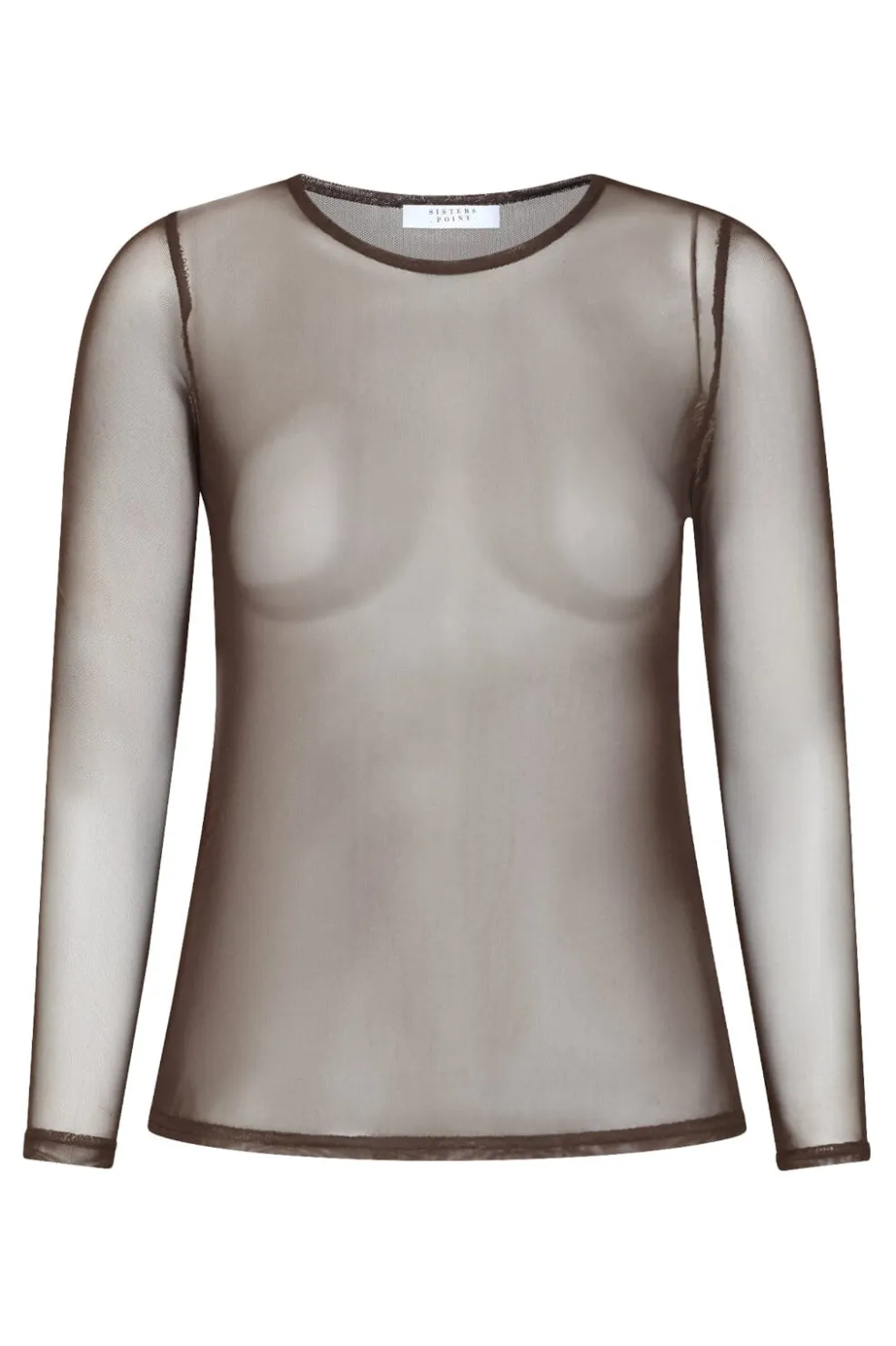 Transparent mesh-top fra Sisters Point i en mørk chokoladebrun farve. Toppen har lange ærmer og en rund halsudskæring.