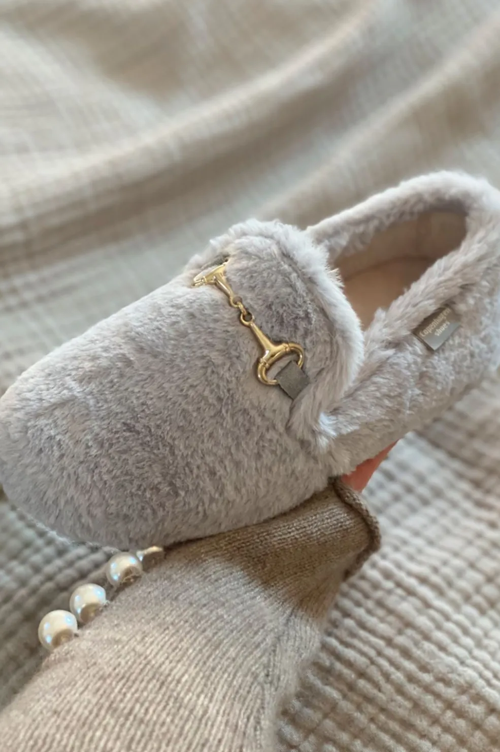 Grå hjemmesko fra Copenhagen Shoes med blødt tekstilmateriale. Skoen har en rund tå og et ensfarvet design med guldfarvet metalspænde på oversiden.