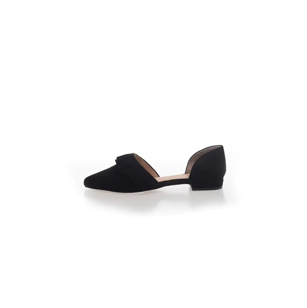 Sorte ballerinasko i ruskind med spids tå og flæsedetalje. Skoene har en latexskumindsål, der giver god støtte gennem dagen.