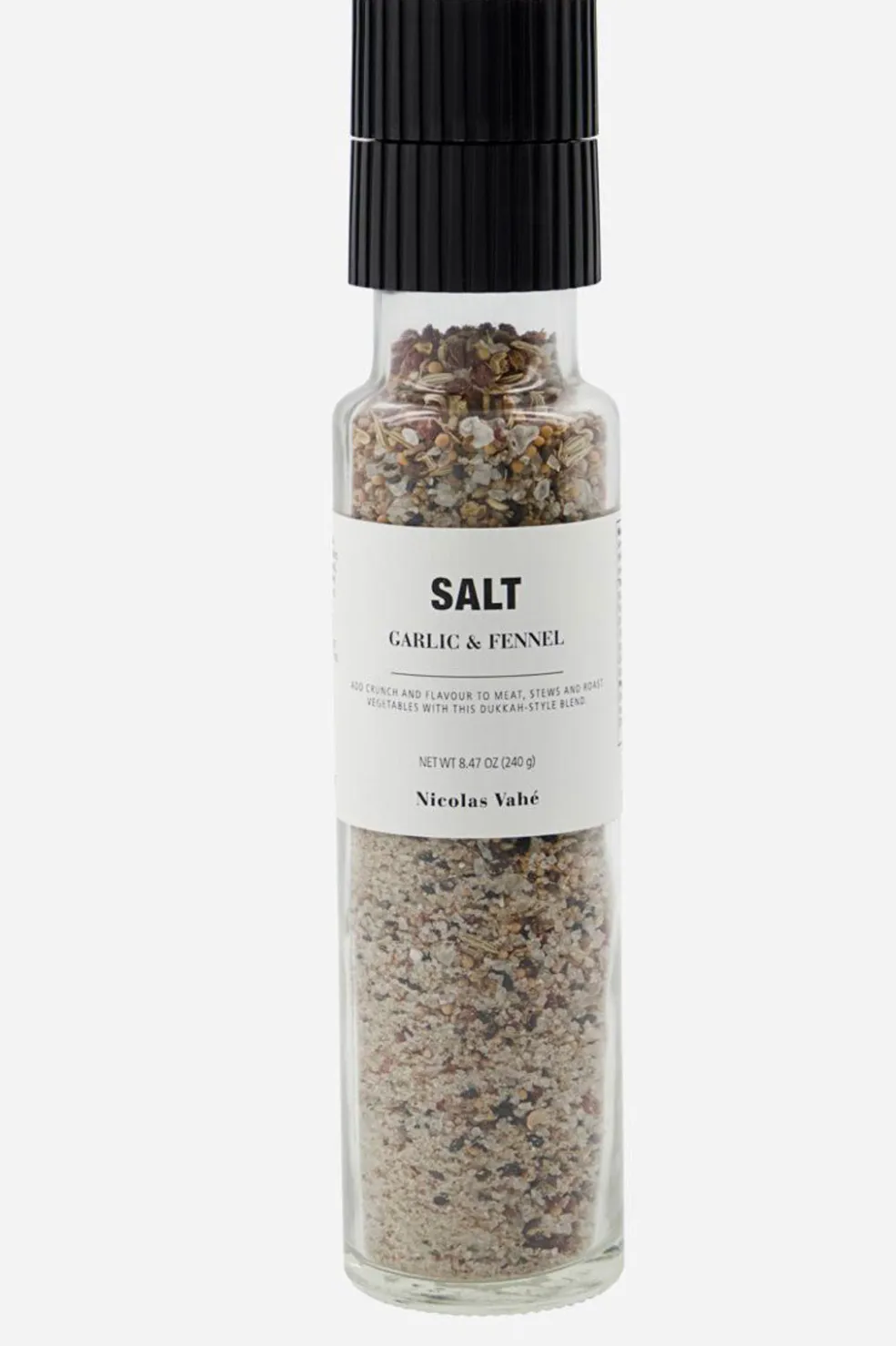 Gør dine supper og simreretter til en kulinarisk oplevelse med dette salt med hvidløg og fennikel fra Nicolas Vahé. Et hint af sort peber, anis, ingefær og citrongræs runder smagen af på eksotisk vis. Du kan også bruge det som alternativ til en dukkah, den populære krydderiblanding som puster liv i enhver ret. Med den keramiske kværn får du fint kværnede krydderier. Det frigiver olierne, så maden får endnu mere aroma og smag.