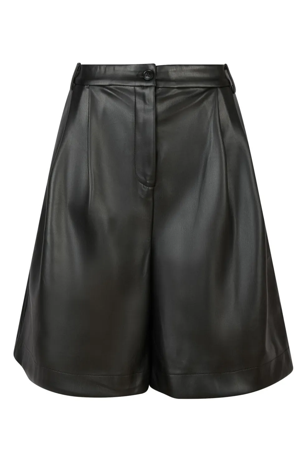 Sorte bermudashorts fra Neo Noir i PU-materiale med knælængde. Shortsene har et ensfarvet design med en skinnende overflade, der giver et trendy udtryk.