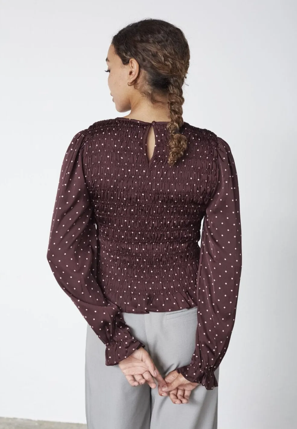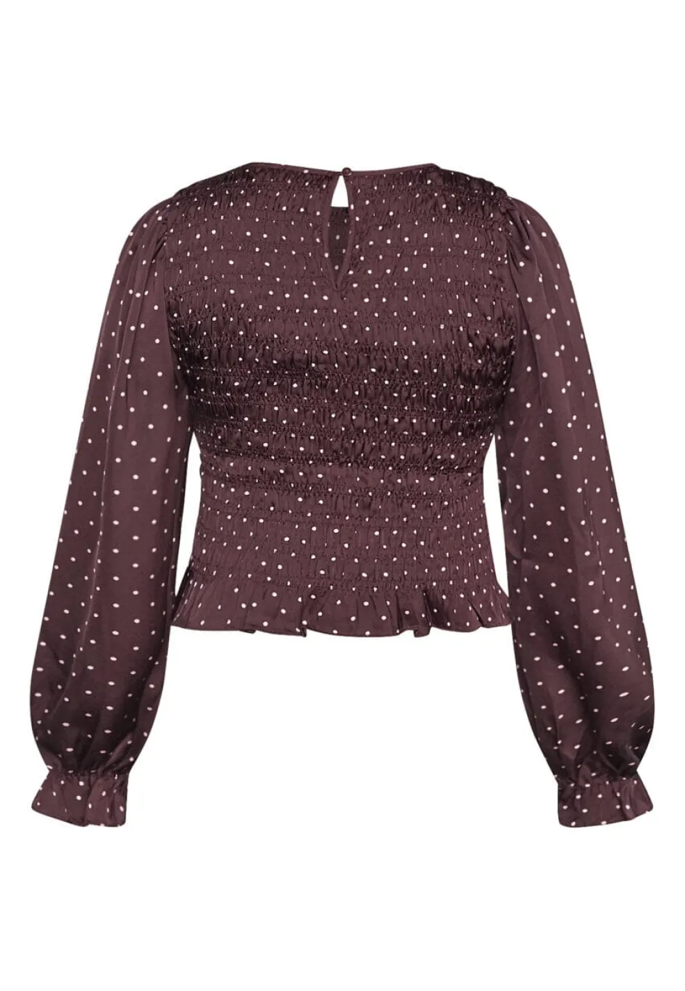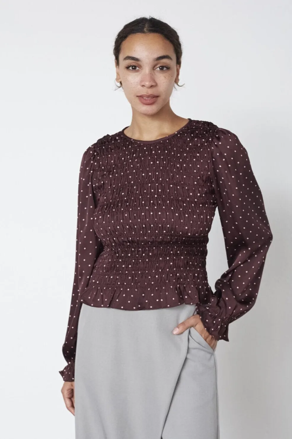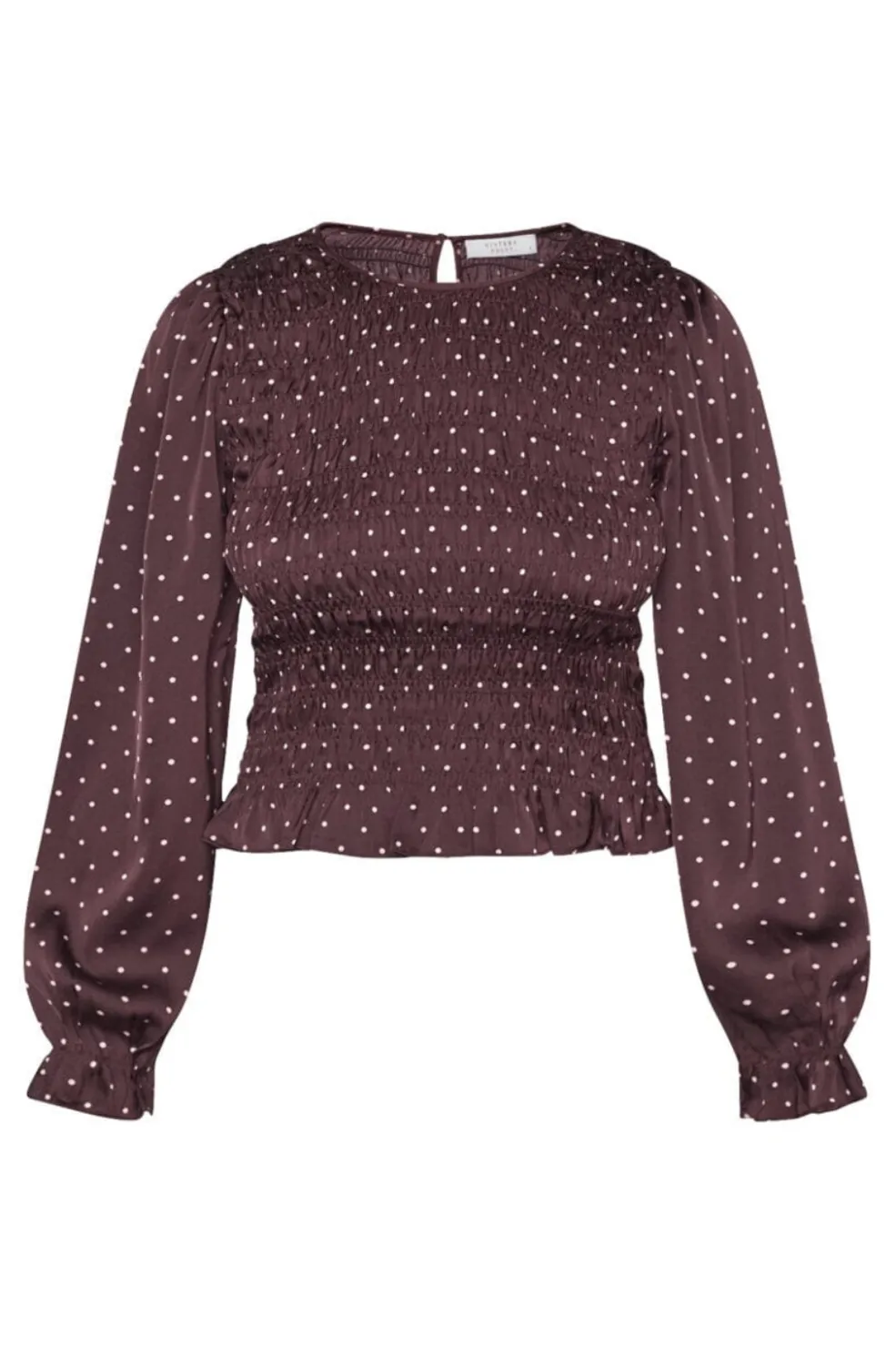 Bordeaux-bluse fra Sisters Point med et prikket mønster. Blusen har dekorative syninger, rynker og flæser, der giver den et detaljeret udtryk.