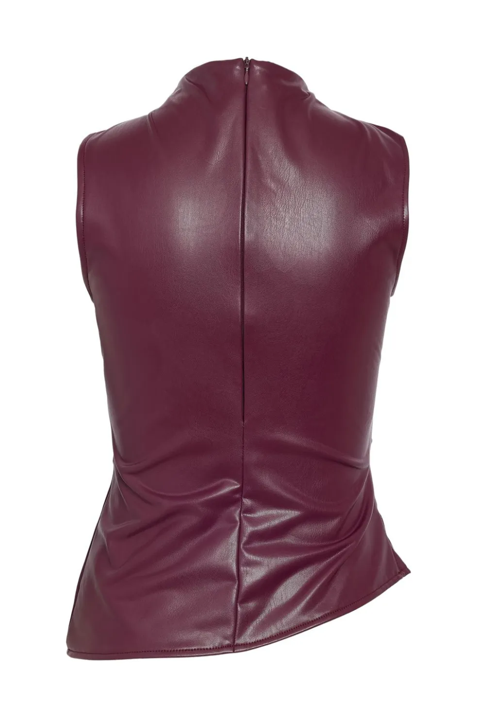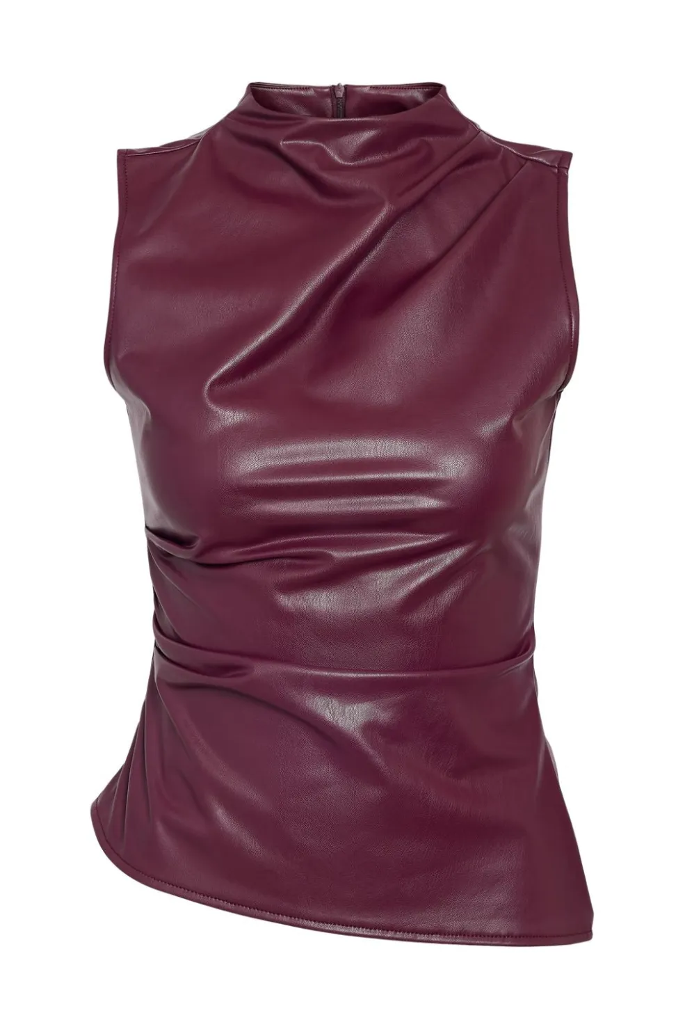 Ærmeløs top fra Noisy May i en dyb vinfarve. Toppen har en tætsiddende pasform og en høj halsudskæring med en glat, skinnende overflade.