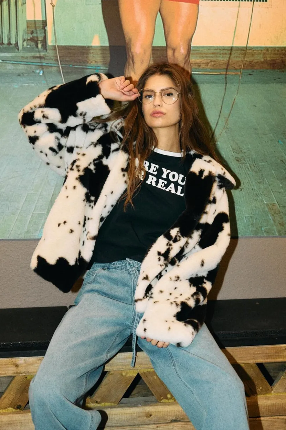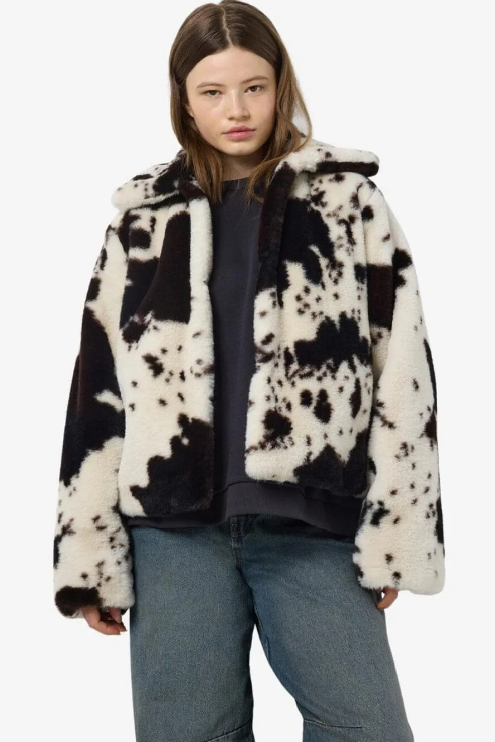 Pelset jakke fra Noisy May i syntetisk pels med sort-hvidt ko-print. Jakken har spredt krave og lange ærmer.