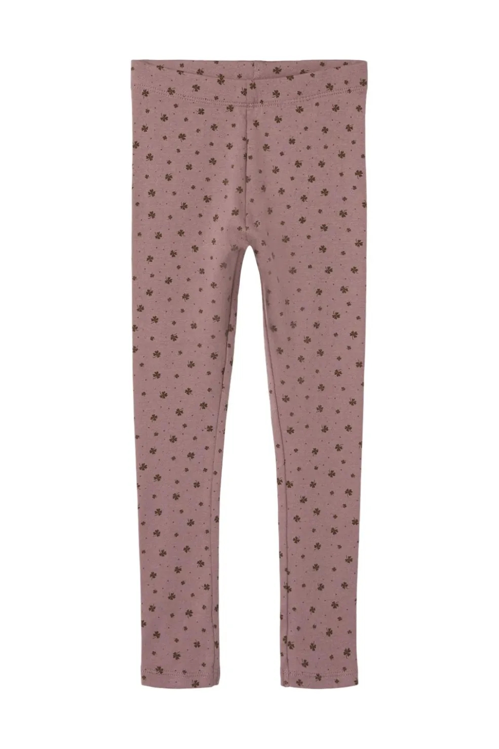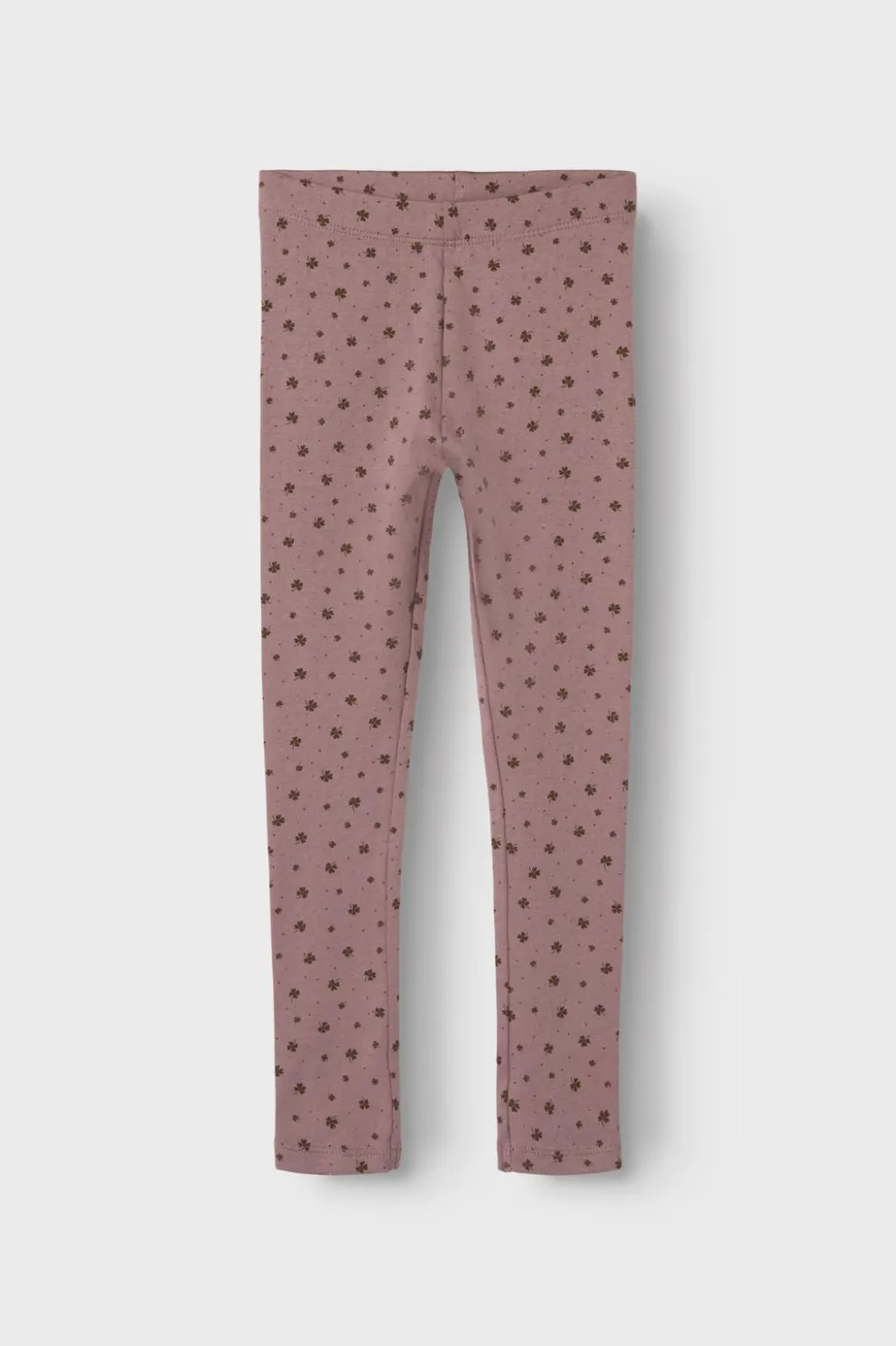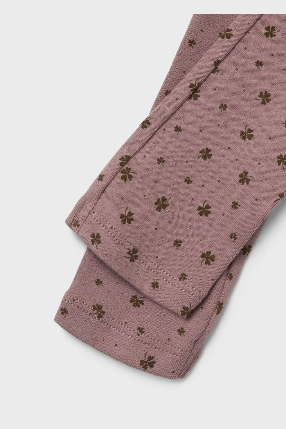 De små mørkebrune blomster på den lyserøde mauve baggrund skaber et fint mønster, der dækker hele leggingsene.