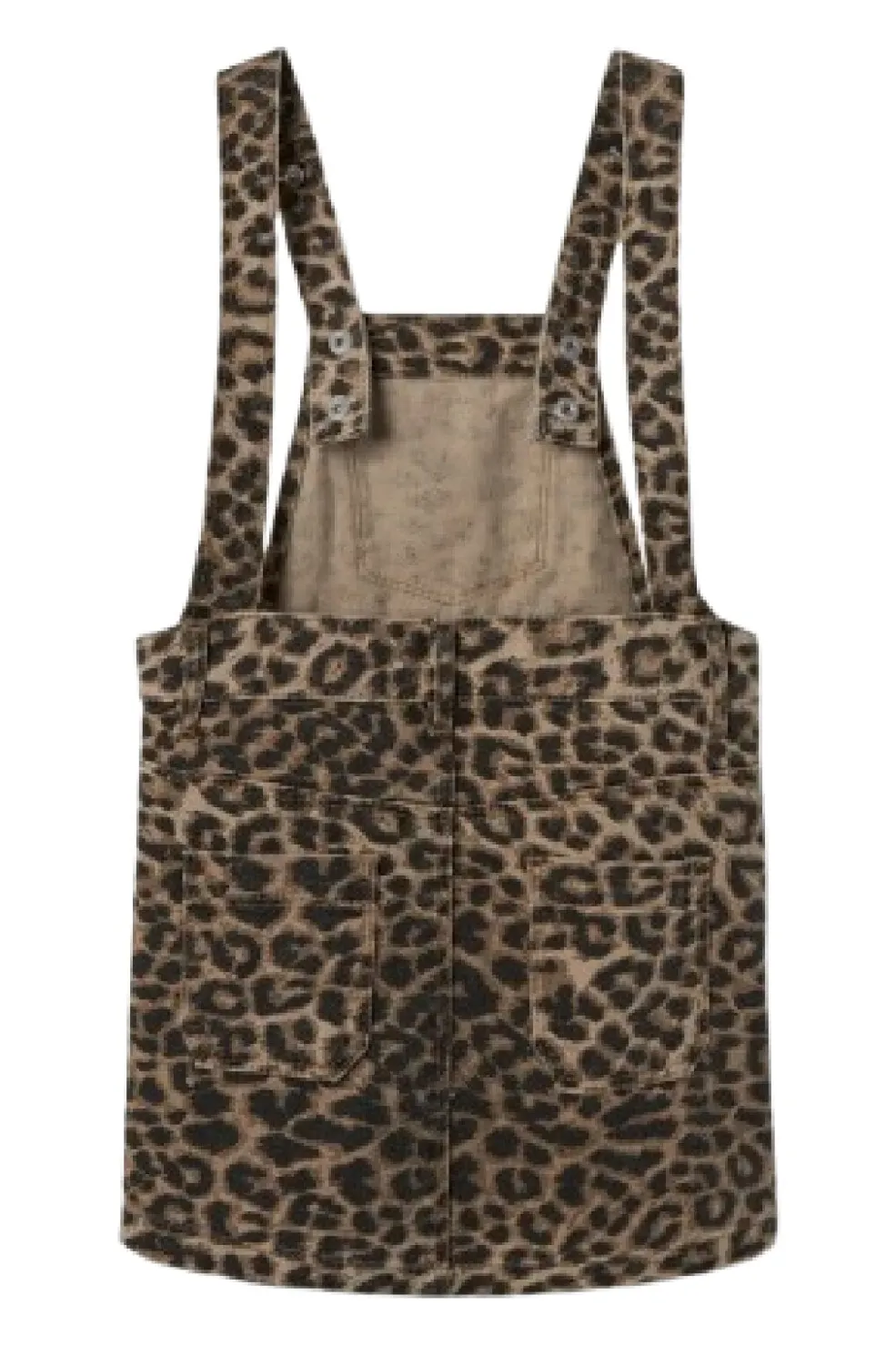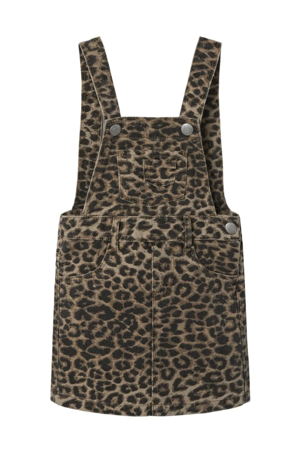 Ærmeløs spencerkjole fra Name It med leopardprint. Kjolen har firkantet halsudskæring og justerbare seler med metalknapper. Praktiske lommer foran, bagpå og en kængurulomme.