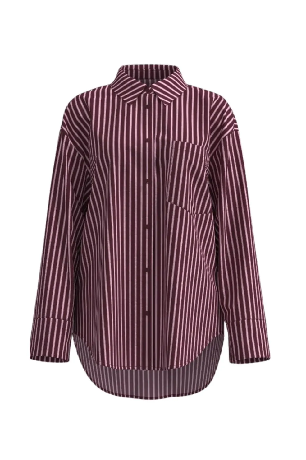 Stribet skjorte fra Noisy May med et mønster i bordeaux, lyserød og hvid. Skjorten har en klassisk krave, brystlomme og knaplukning foran.