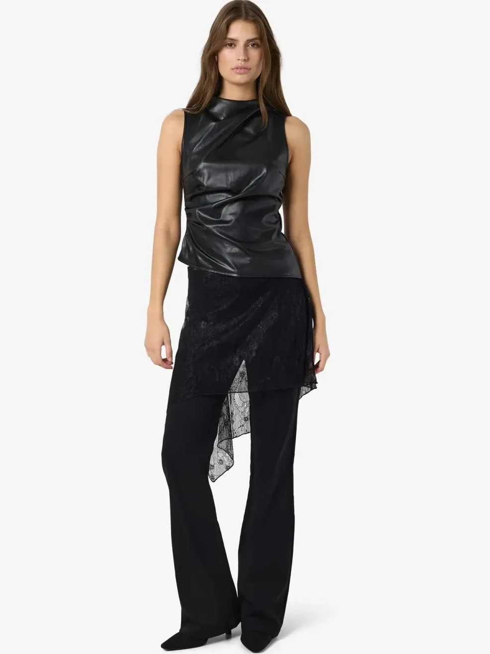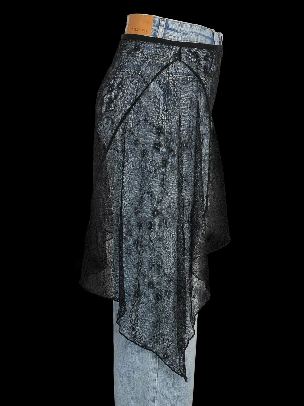 Sort blonde-nederdel fra Noisy May, designet til at bæres over jeans eller bukser. Nederdelen har et floralt blondemønster og en asymmetrisk kant.