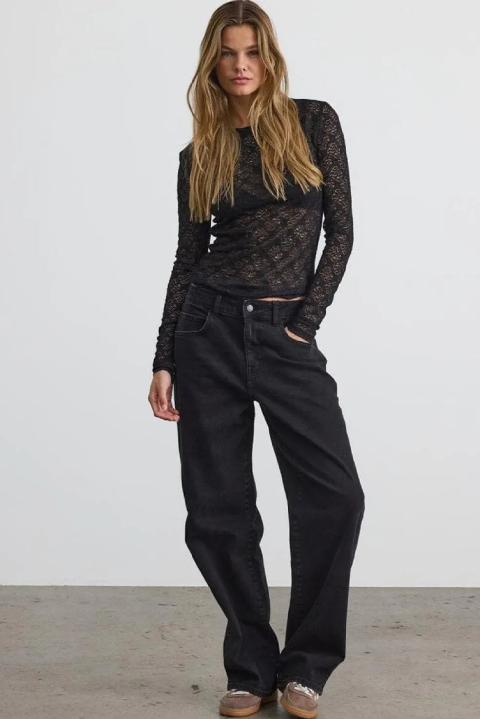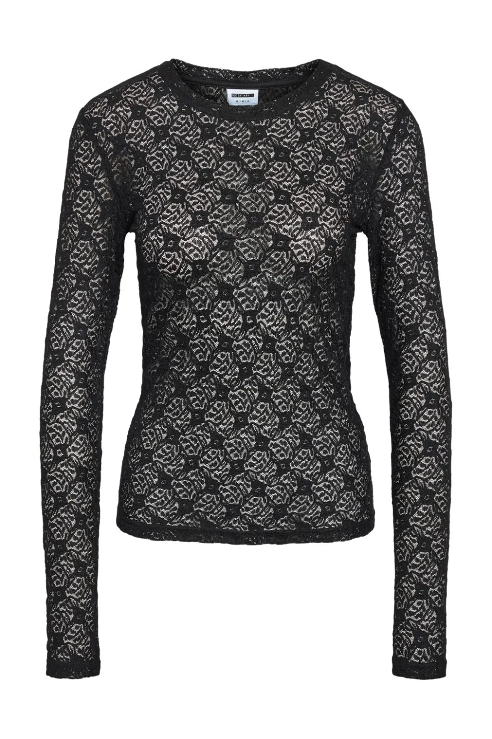 Sort blondebluse fra Noisy May med et blomstret mønster. Toppen har lange ærmer og en rund halsudskæring.