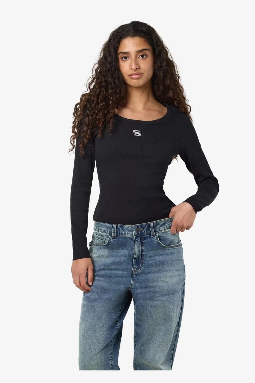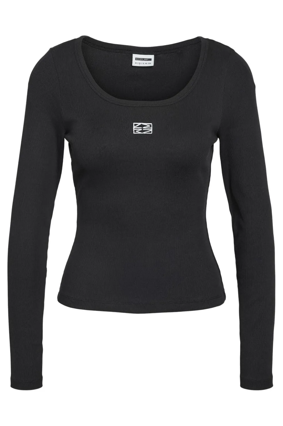 Sort langærmet top fra Noisy May med hvidt broderi. Lavet af økologisk bomuld og elastan med slim fit-pasform og rund hals.