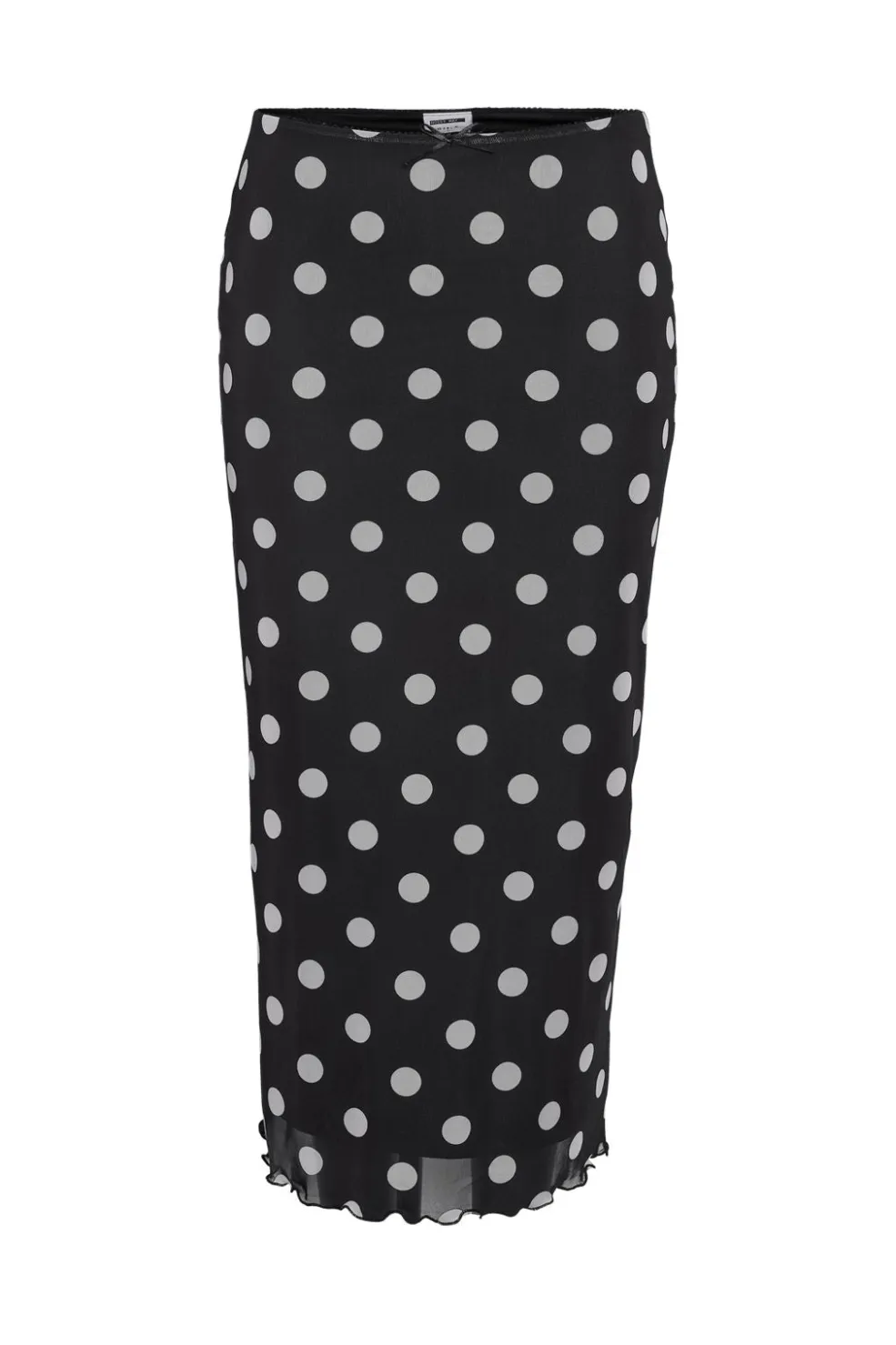 Sort maxi-nederdel fra Noisy May med store hvide polkaprikker. Nederdelen har flæser og sløjfer ved kanten.
