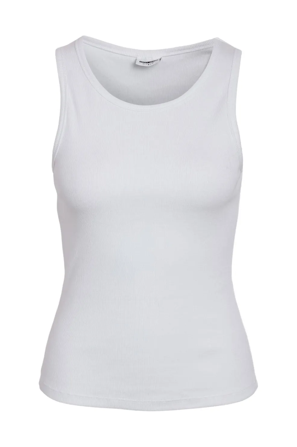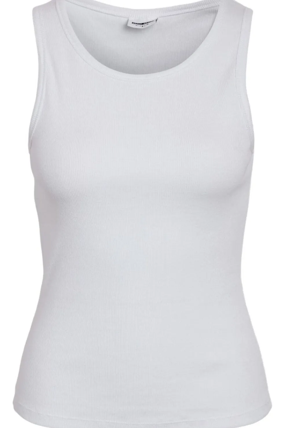 Hvid tanktop fra Noisy May med tætsiddende pasform. Det enkle design gør den nem at style til både afslappede og mere formelle anledninger.