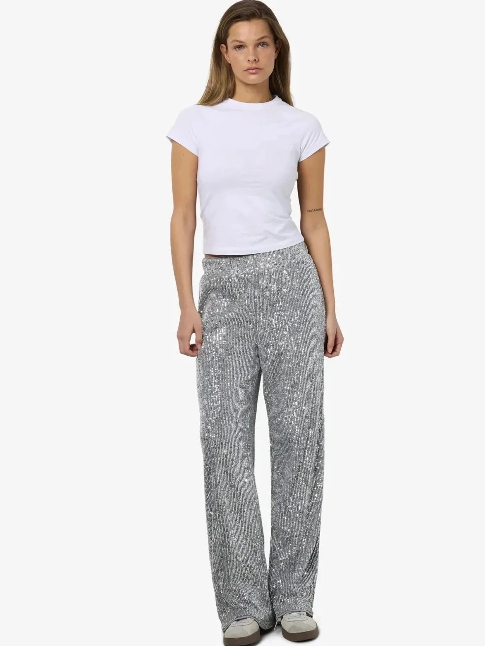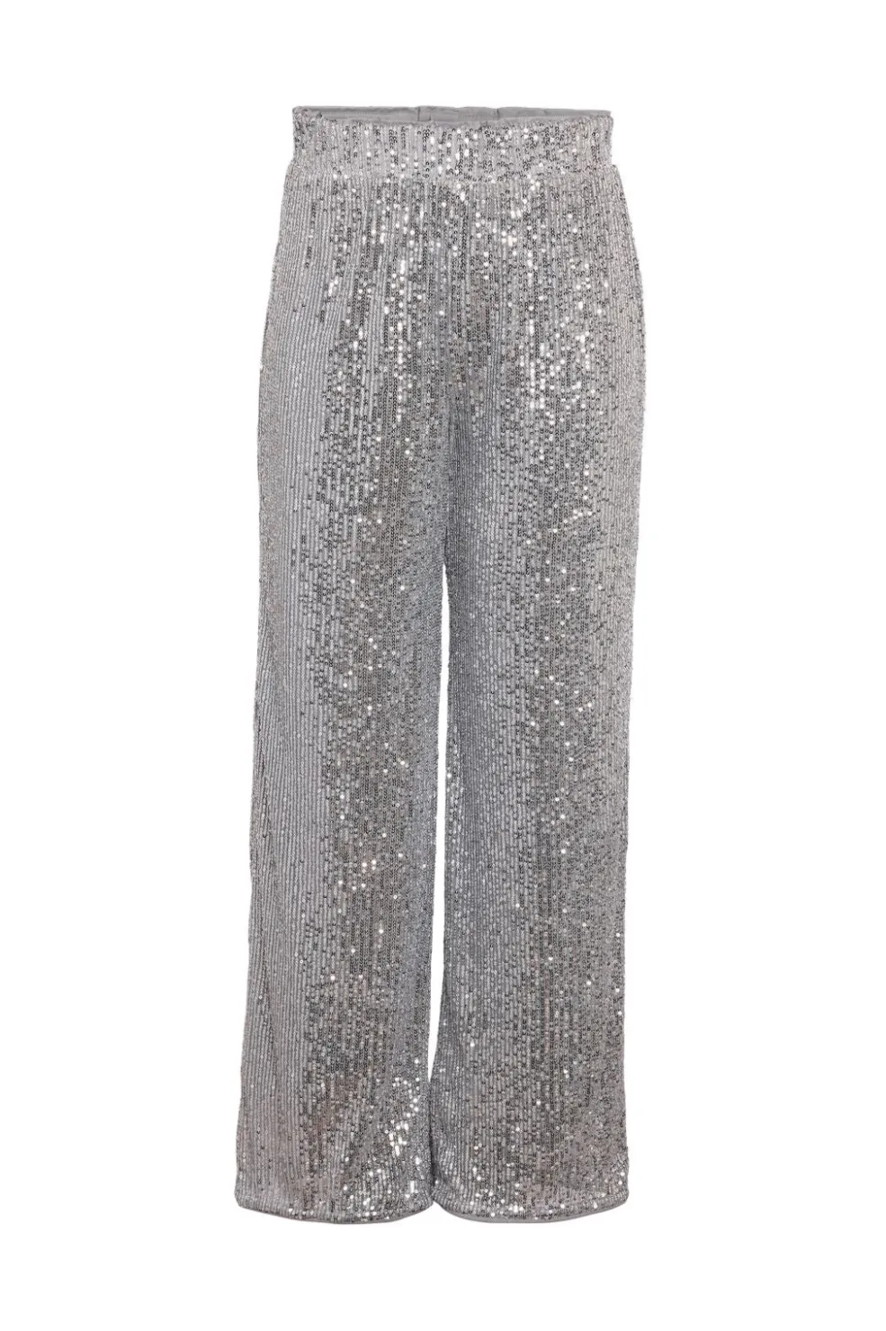 Sølvfarvede bukser fra Noisy May, fuldt dækket med pailletter. Bukserne har et bredt ben-design og en løs pasform, der passer til fejringer.