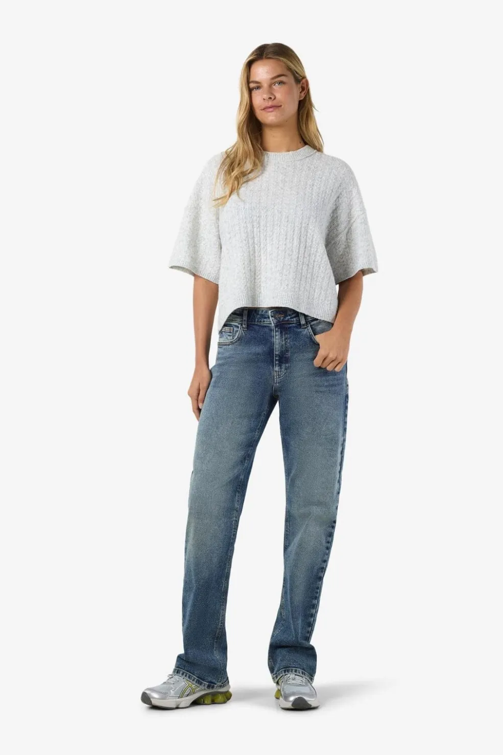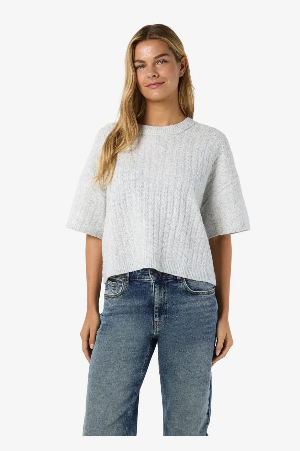 Kortærmet strikket top fra Noisy May i lys grå melange. Toppen har en kabelstrikstruktur og en rund halsudskæring med regulær pasform.