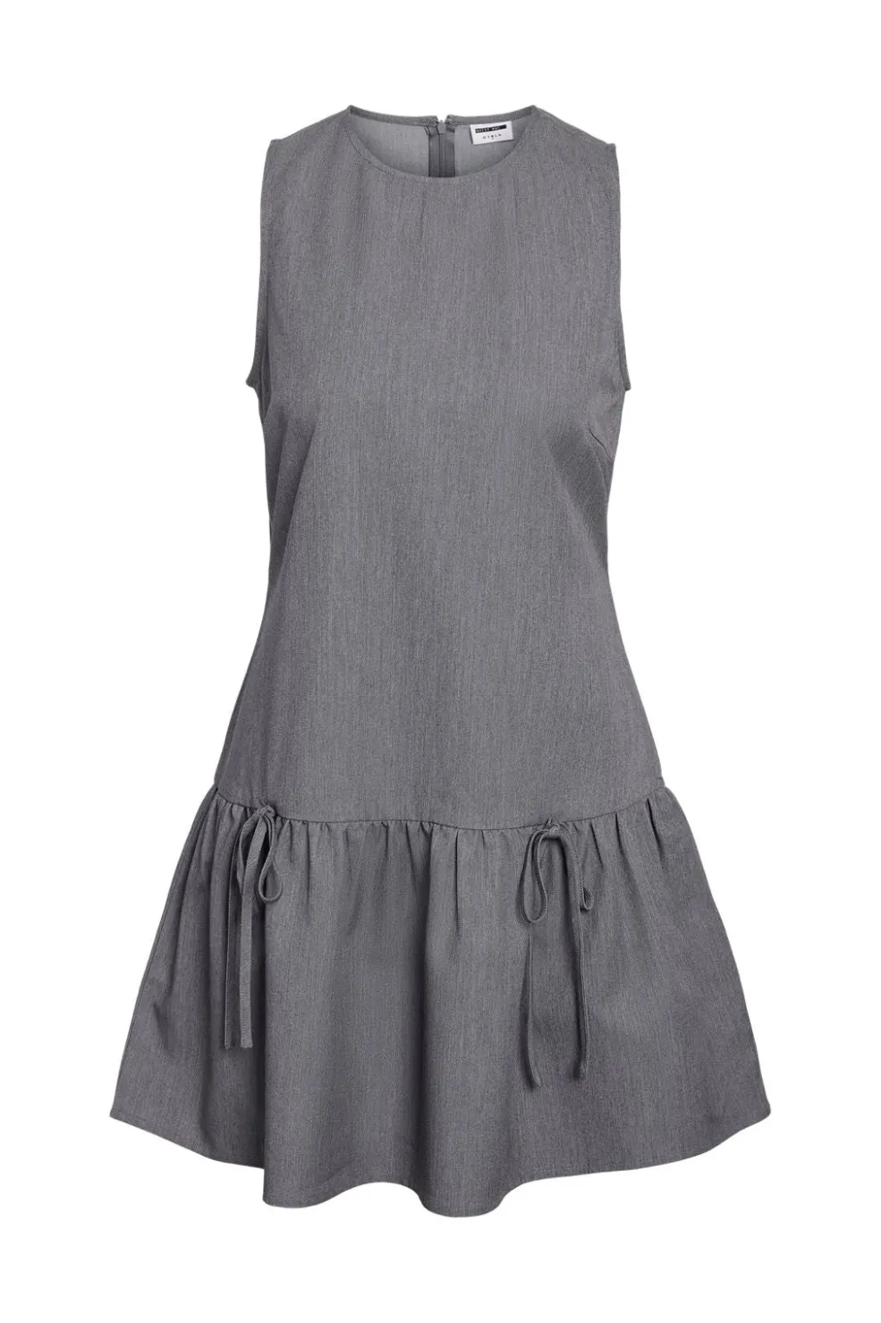 Ærmeløs kjole fra Noisy May i lys grå melange. Kjolen har peplumdesign med bindebånd i taljen og flæsedetaljer.