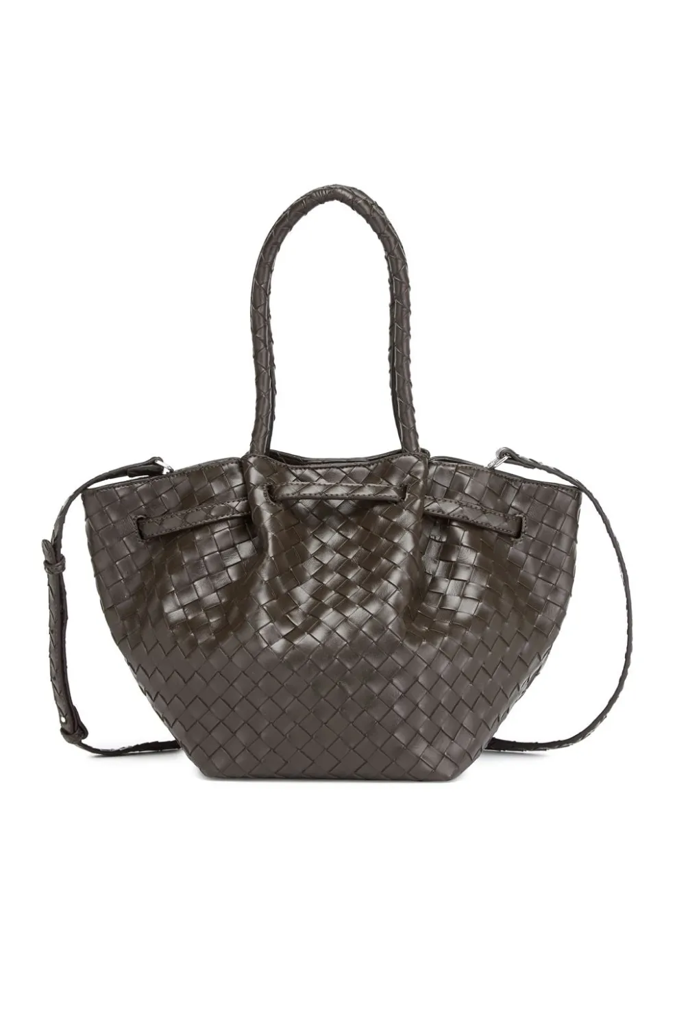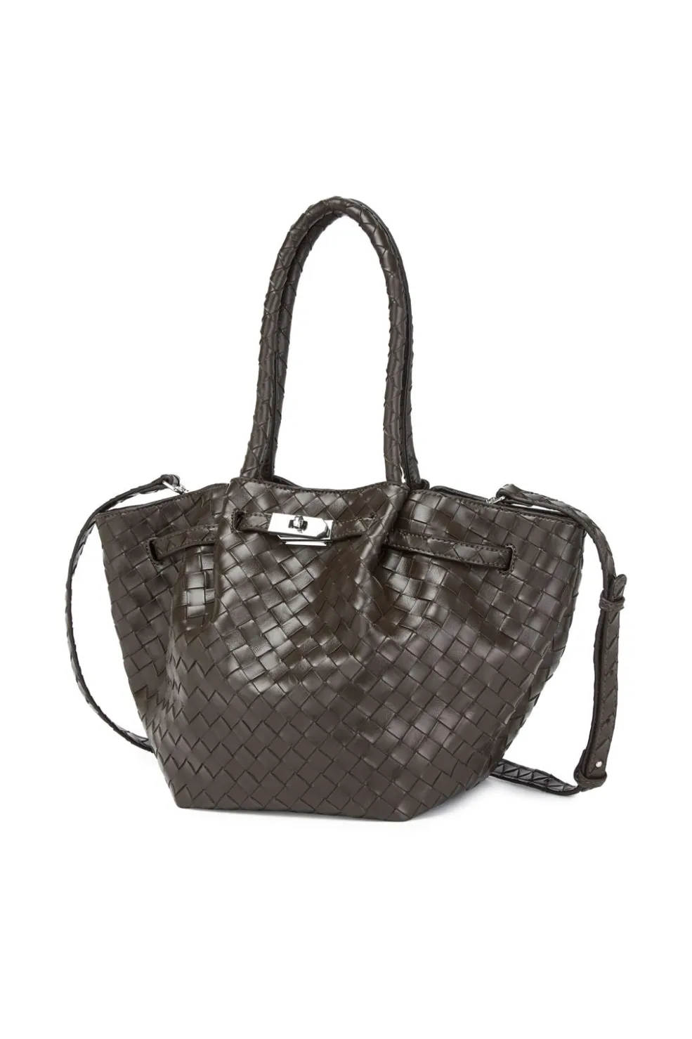 Stor taske fra Noella i mørkebrun med flettet mønster. Tasken har to håndtag og en aftagelig skulderrem.