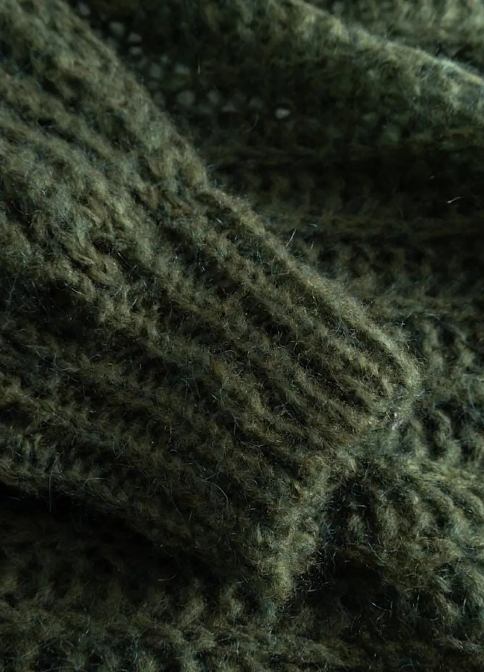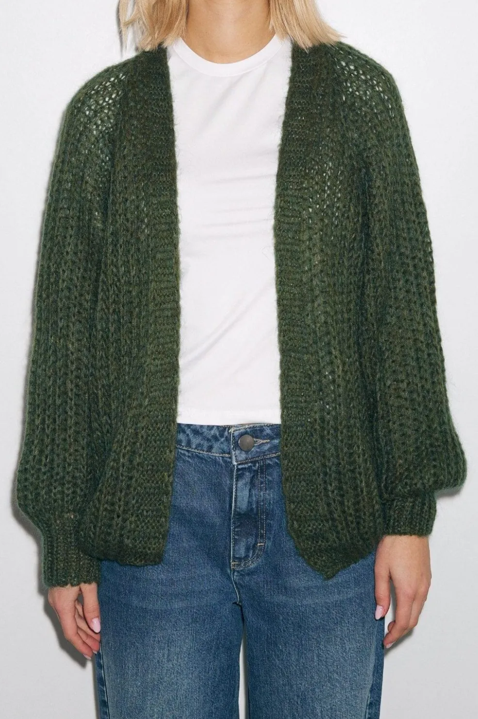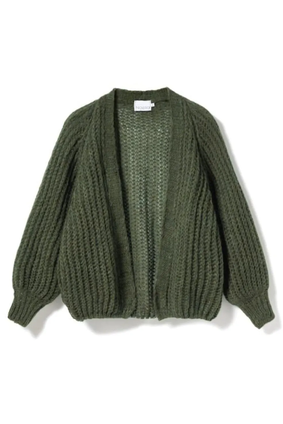 Armygrøn cardigan fra Noella med løs pasform og åben front. Den ribstrikkede tekstur og de let puffede ærmer giver cardiganen et afslappet udtryk.