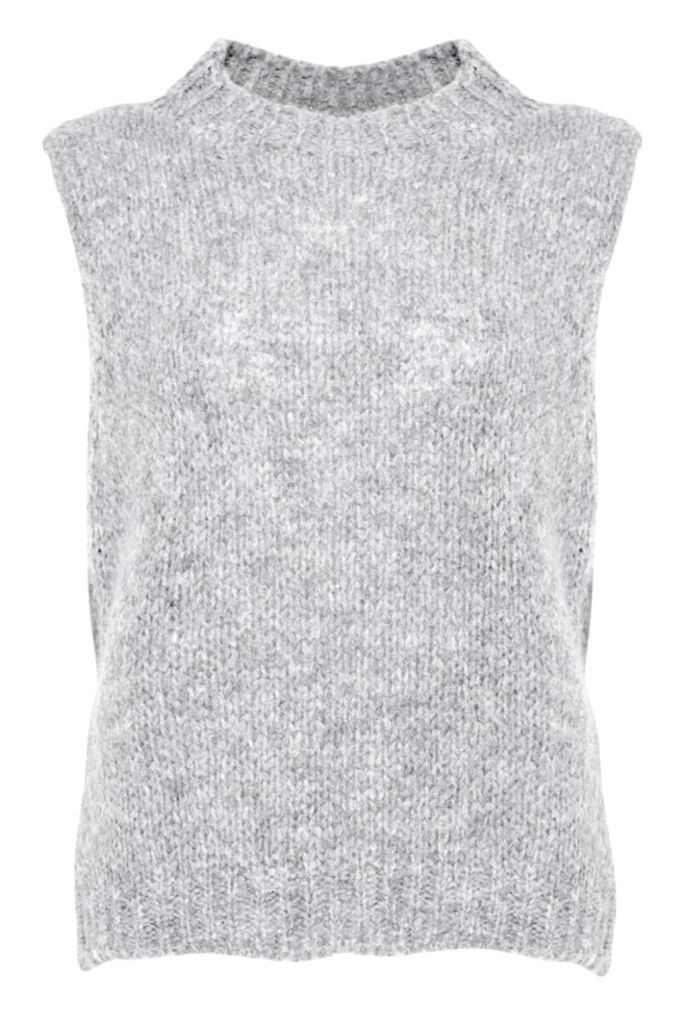 Strikvest fra Noella i lys grå melange. Den ærmeløse vest har en rund halsudskæring med ribkant og en afslappet pasform, der gør den nem at style med andre dele.