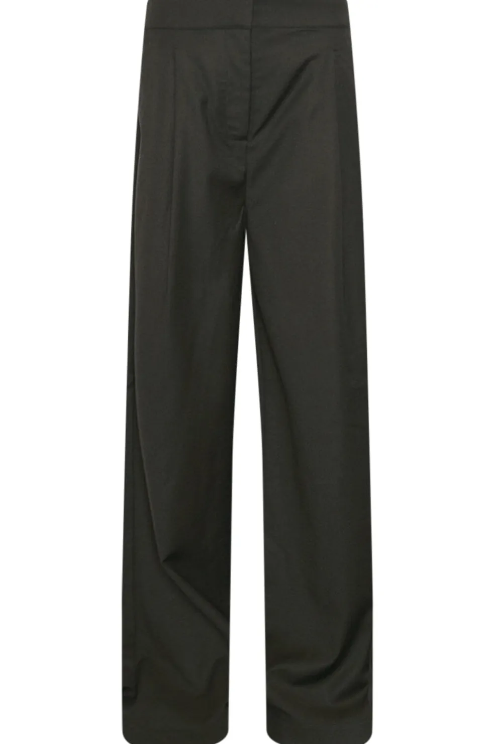 Sorte bukser fra Noella med en løs pasform og gulvlængde. De er lavet i en blød materialekombination med lynlåslukning og mellemhøj talje. Bukserne har dekorative syninger og et enkelt design.