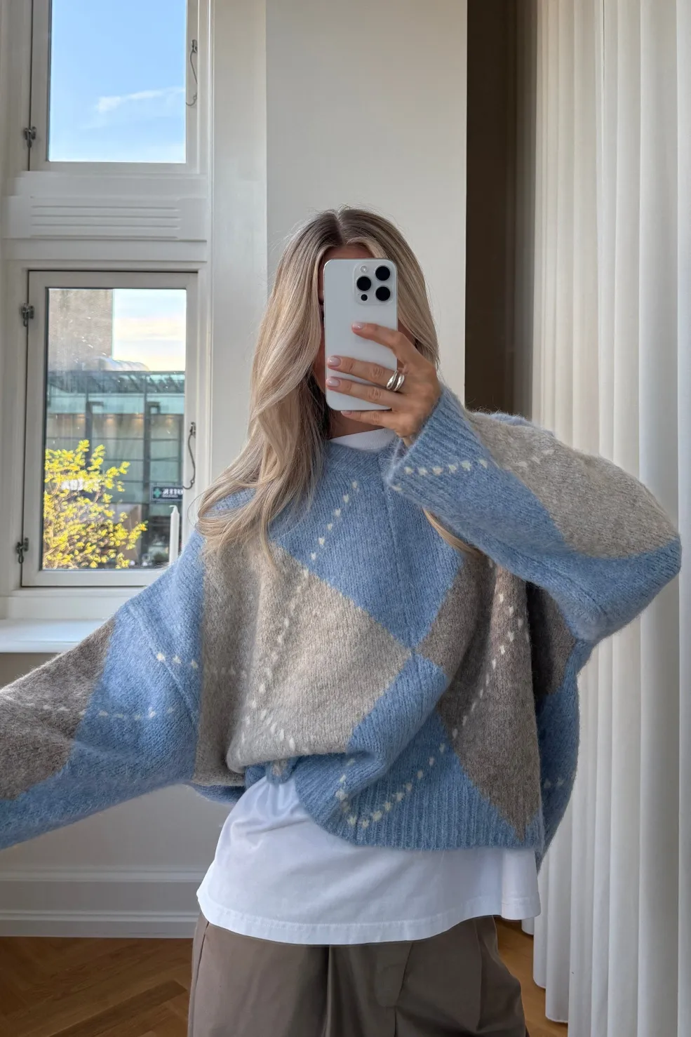- Himmelblå med beige argyle-mønster