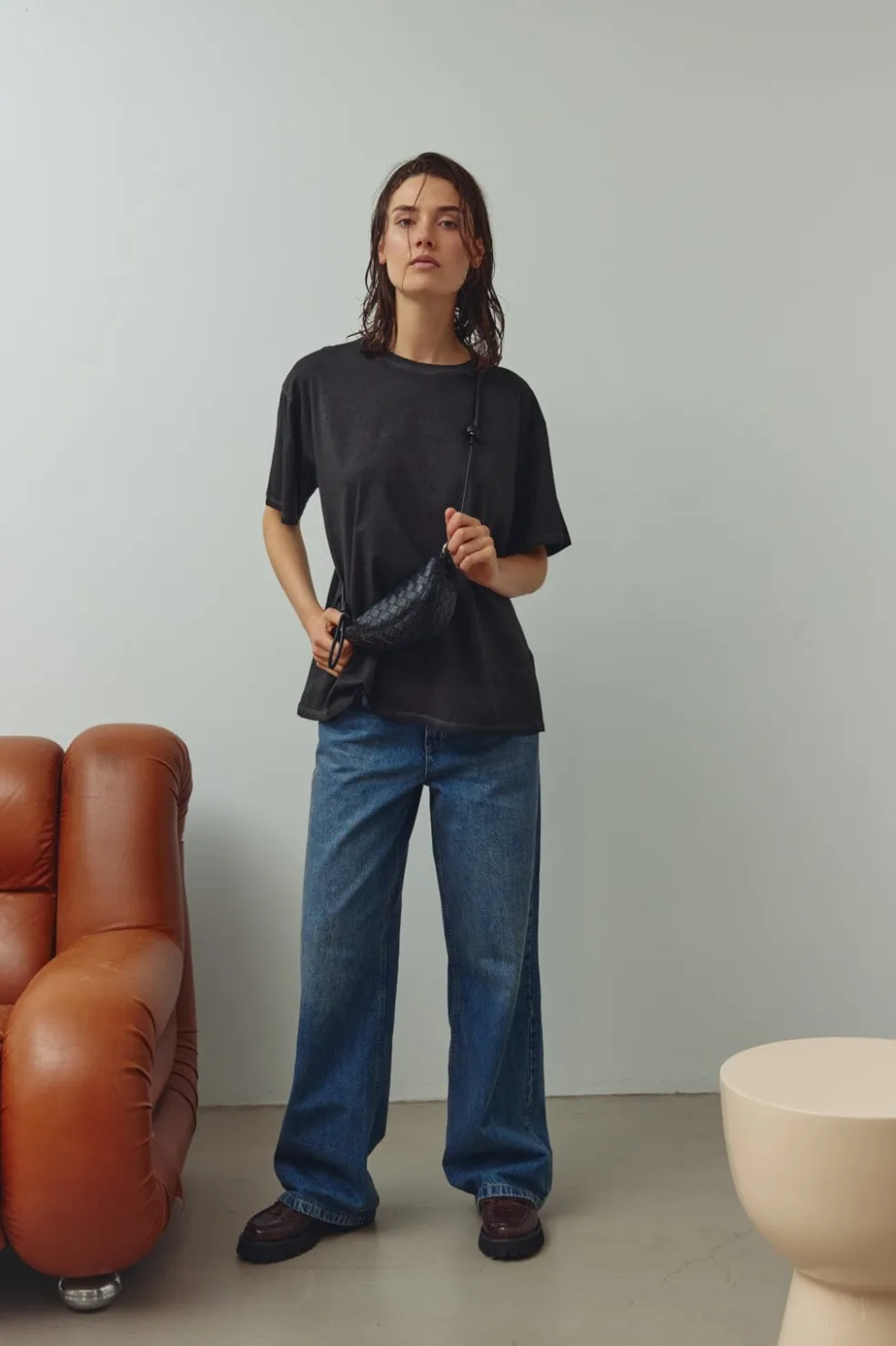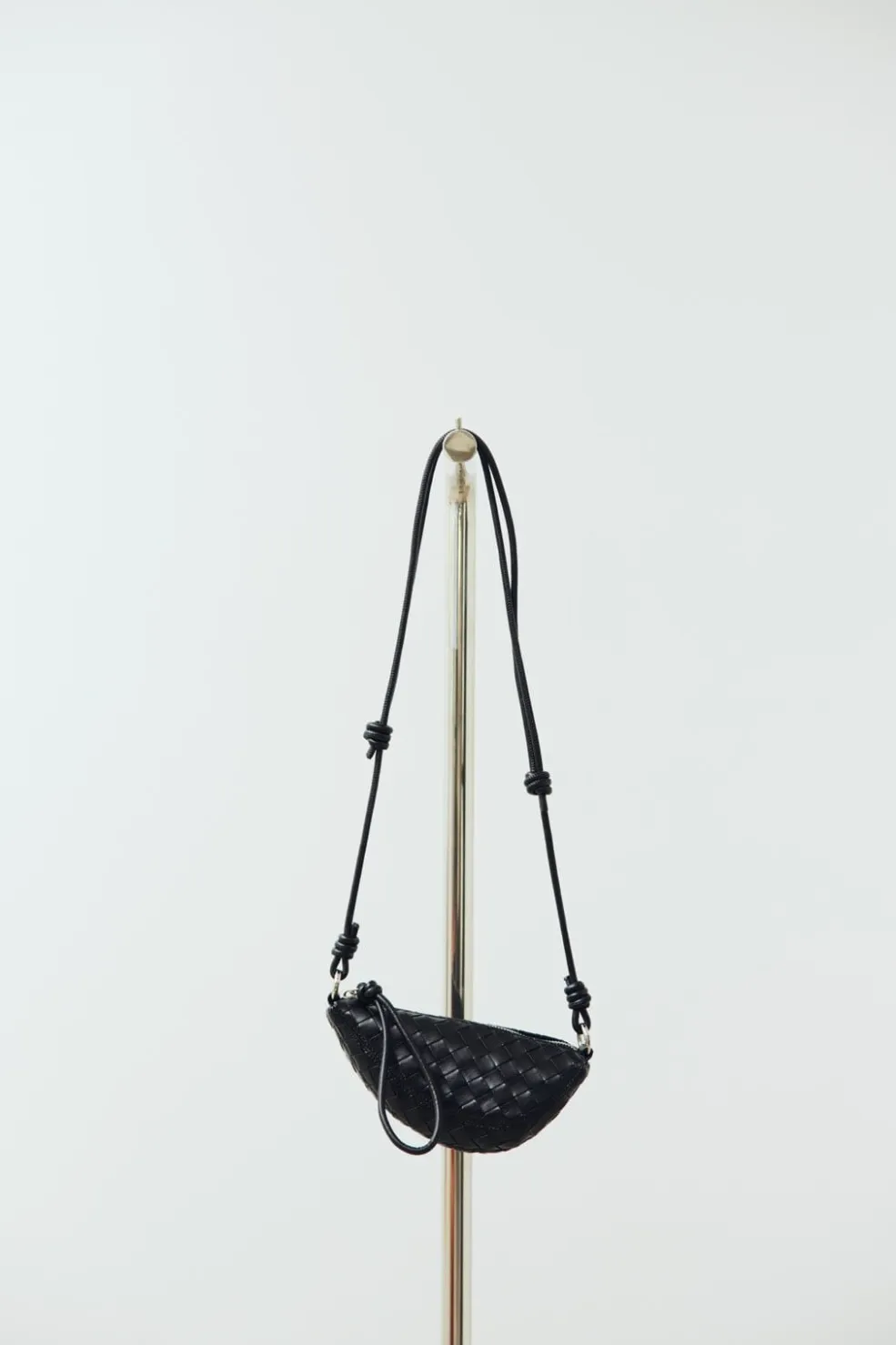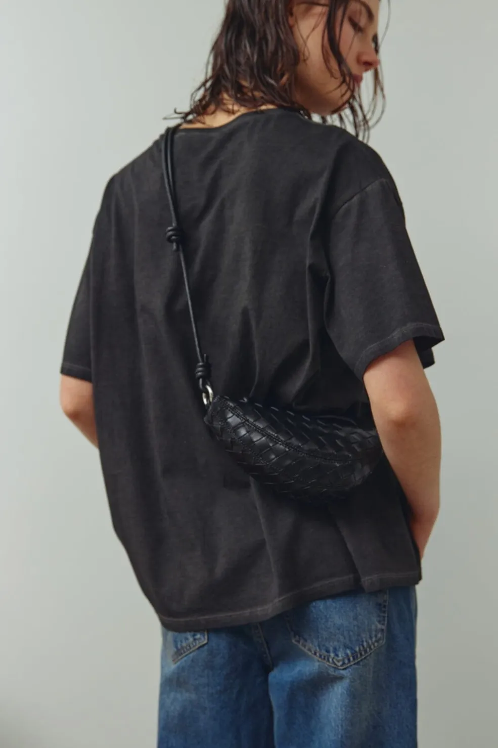 Sort taske fra Noella med en halvmåneform og flettet tekstur. Tasken er lavet af polyurethan og har en asymmetrisk form.