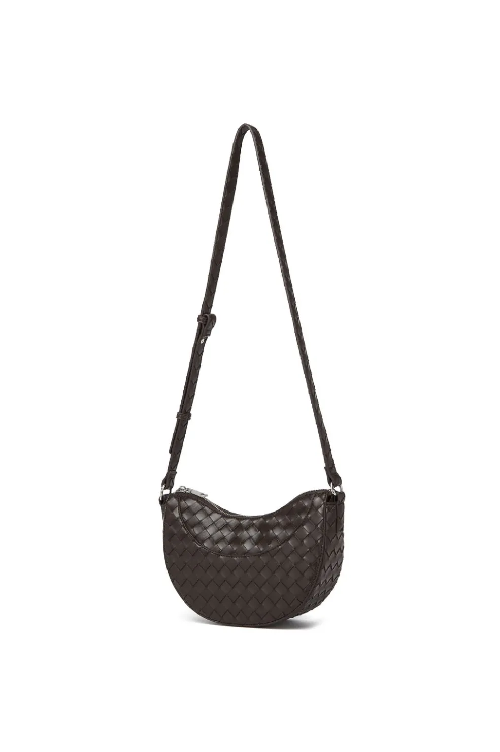 Skuldertaske fra Noella i brun kaffe-farve, lavet af 100 % polyurethan med en vævet tekstur og en halvmåneformet silhuet.