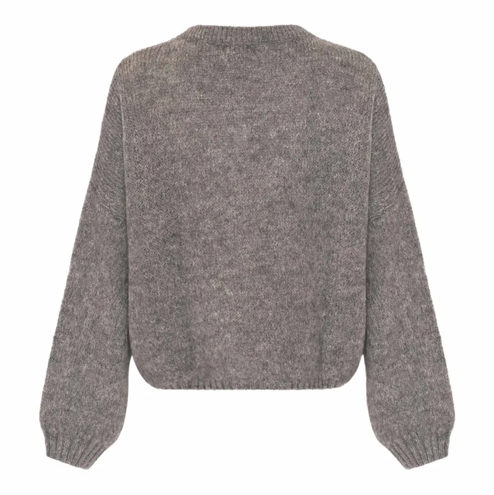 Grå striktrøje fra Noella, strikket i marl-mønster. Trøjen passer til afslappet brug og hjemmetøj.